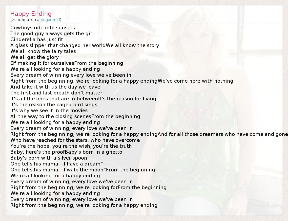 Cowboys ride into sunsets The good guy always gets the girl Cinderella has just fit A glass slipper that changed her worldWe all know the story We all know the fairy tales We all get the glory Of making it for ourselvesFrom the beginning We're all looking for a happy ending Every dream of winning every love we've been in Right from the beginning, we're looking for a happy endingWe've come here with nothing And take it with us the day we leave The first and last breath don't matter It's all the ones that are in betweenIt's the reason for living It's the reason the caged bird sings It's why we see it in the movies All the way to the closing scenesFrom the beginning We're all looking for a happy ending Every dream of winning, every love we've been in Right from the beginning, we're looking for a happy endingAnd for all those dreamers who have come and gone Who have reached for the stars, who have overcome You're the hope, you're the wish, you're the truth Baby, here's the proofBaby's born in a ghetto Baby's born with a silver spoon One tells his mama, "I have a dream" One tells his mama, "I walk the moon"From the beginning We're all looking for a happy ending Every dream of winning, every love we've been in Right from the beginning, we're looking forFrom the beginning We're all looking for a happy ending Every dream of winning, every love we've been in Right from the beginning, we're looking for a happy ending