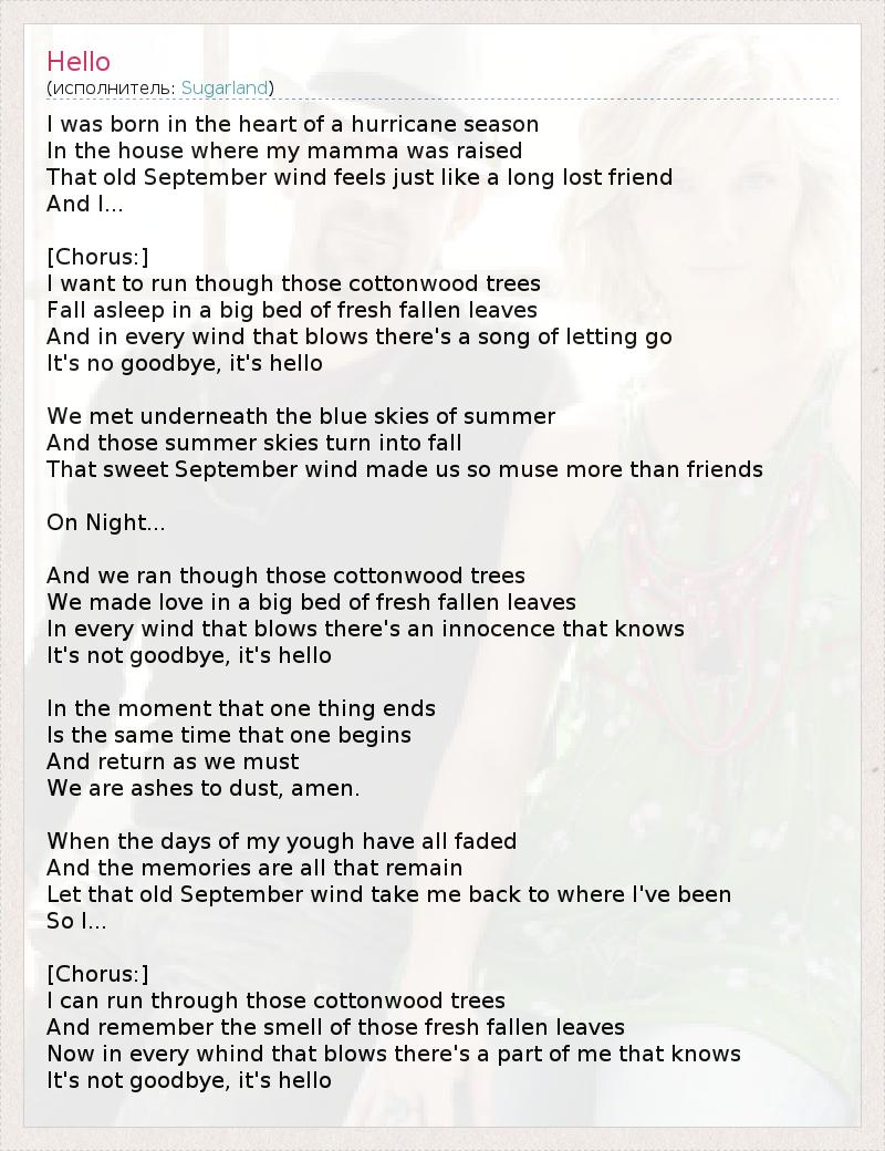 I was born in the heart of a hurricane season In the house where my mamma was raised That old September wind feels just like a long lost friend And I... [Chorus:] I want to run though those cottonwood trees Fall asleep in a big bed of fresh fallen leaves And in every wind that blows there's a song of letting go It's no goodbye, it's hello We met underneath the blue skies of summer And those summer skies turn into fall That sweet September wind made us so muse more than friends On Night... And we ran though those cottonwood trees We made love in a big bed of fresh fallen leaves In every wind that blows there's an innocence that knows It's not goodbye, it's hello In the moment that one thing ends Is the same time that one begins And return as we must We are ashes to dust, amen. When the days of my yough have all faded And the memories are all that remain Let that old September wind take me back to where I've been So I... [Chorus:] I can run through those cottonwood trees And remember the smell of those fresh fallen leaves Now in every whind that blows there's a part of me that knows It's not goodbye, it's hello