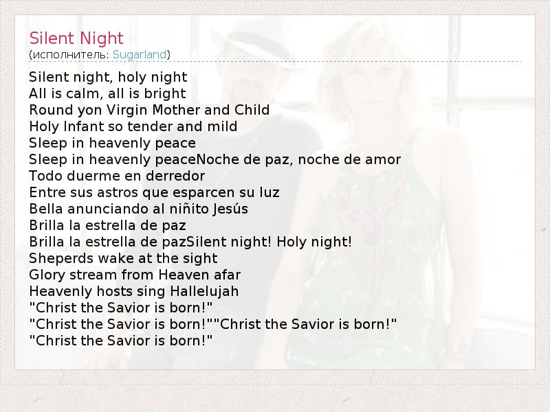 Silent night, holy night All is calm, all is bright Round yon Virgin Mother and Child Holy Infant so tender and mild Sleep in heavenly peace Sleep in heavenly peaceNoche de paz, noche de amor Todo duerme en derredor Entre sus astros que esparcen su luz Bella anunciando al niñito Jesús Brilla la estrella de paz Brilla la estrella de pazSilent night! Holy night! Sheperds wake at the sight Glory stream from Heaven afar Heavenly hosts sing Hallelujah "Christ the Savior is born!" "Christ the Savior is born!""Christ the Savior is born!" "Christ the Savior is born!"
