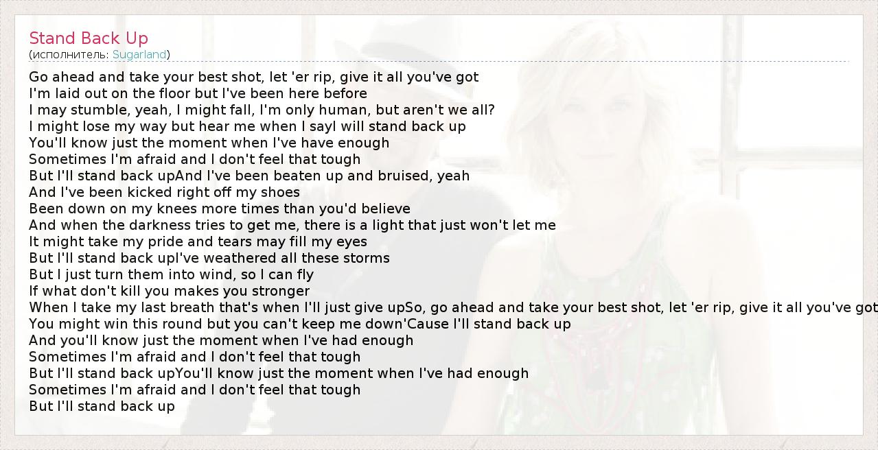 Go ahead and take your best shot, let 'er rip, give it all you've got I'm laid out on the floor but I've been here before I may stumble, yeah, I might fall, I'm only human, but aren't we all? I might lose my way but hear me when I sayI will stand back up You'll know just the moment when I've have enough Sometimes I'm afraid and I don't feel that tough But I'll stand back upAnd I've been beaten up and bruised, yeah And I've been kicked right off my shoes Been down on my knees more times than you'd believe And when the darkness tries to get me, there is a light that just won't let me It might take my pride and tears may fill my eyes But I'll stand back upI've weathered all these storms But I just turn them into wind, so I can fly If what don't kill you makes you stronger When I take my last breath that's when I'll just give upSo, go ahead and take your best shot, let 'er rip, give it all you've got You might win this round but you can't keep me down'Cause I'll stand back up And you'll know just the moment when I've had enough Sometimes I'm afraid and I don't feel that tough But I'll stand back upYou'll know just the moment when I've had enough Sometimes I'm afraid and I don't feel that tough But I'll stand back up
