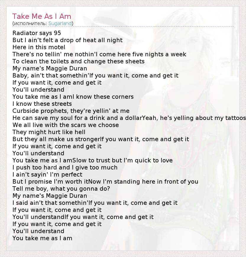 А как ты думаешь, о чем песня "Take Me As I Am" ?