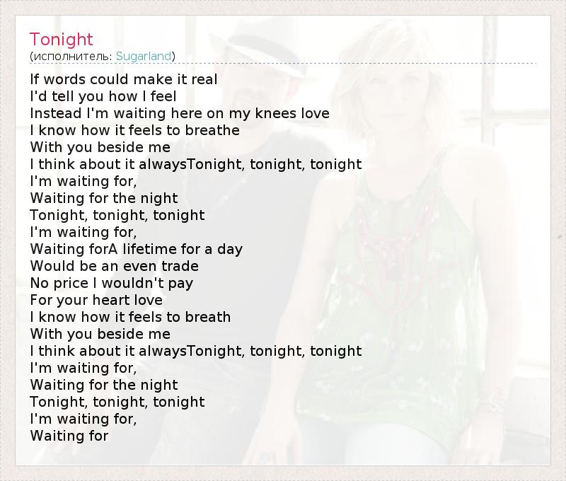 If words could make it real I'd tell you how I feel Instead I'm waiting here on my knees love I know how it feels to breathe With you beside me I think about it alwaysTonight, tonight, tonight I'm waiting for, Waiting for the night Tonight, tonight, tonight I'm waiting for, Waiting forA lifetime for a day Would be an even trade No price I wouldn't pay For your heart love I know how it feels to breath With you beside me I think about it alwaysTonight, tonight, tonight I'm waiting for, Waiting for the night Tonight, tonight, tonight I'm waiting for, Waiting for