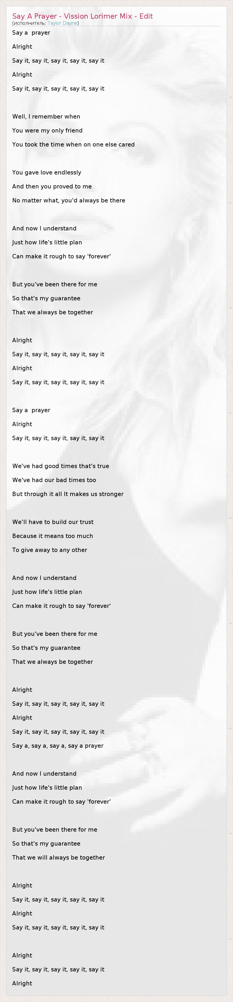 Say a prayer Alright Say it, say it, say it, say it, say it Alright Say it, say it, say it, say it, say it Well, I remember when You were my only friend You took the time when on one else cared You gave love endlessly And then you proved to me No matter what, you'd always be there And now I understand Just how life's little plan Can make it rough to say 'forever' But you've been there for me So that's my guarantee That we always be together Alright Say it, say it, say it, say it, say it Alright Say it, say it, say it, say it, say it Say a prayer Alright Say it, say it, say it, say it, say it We've had good times that's true We've had our bad times too But through it all It makes us stronger We'll have to build our trust Because it means too much To give away to any other And now I understand Just how life's little plan Can make it rough to say 'forever' But you've been there for me So that's my guarantee That we always be together Alright Say it, say it, say it, say it, say it Alright Say it, say it, say it, say it, say it Say a, say a, say a, say a prayer And now I understand Just how life's little plan Can make it rough to say 'forever' But you've been there for me So that's my guarantee That we will always be together Alright Say it, say it, say it, say it, say it Alright Say it, say it, say it, say it, say it Alright Say it, say it, say it, say it, say it Alright