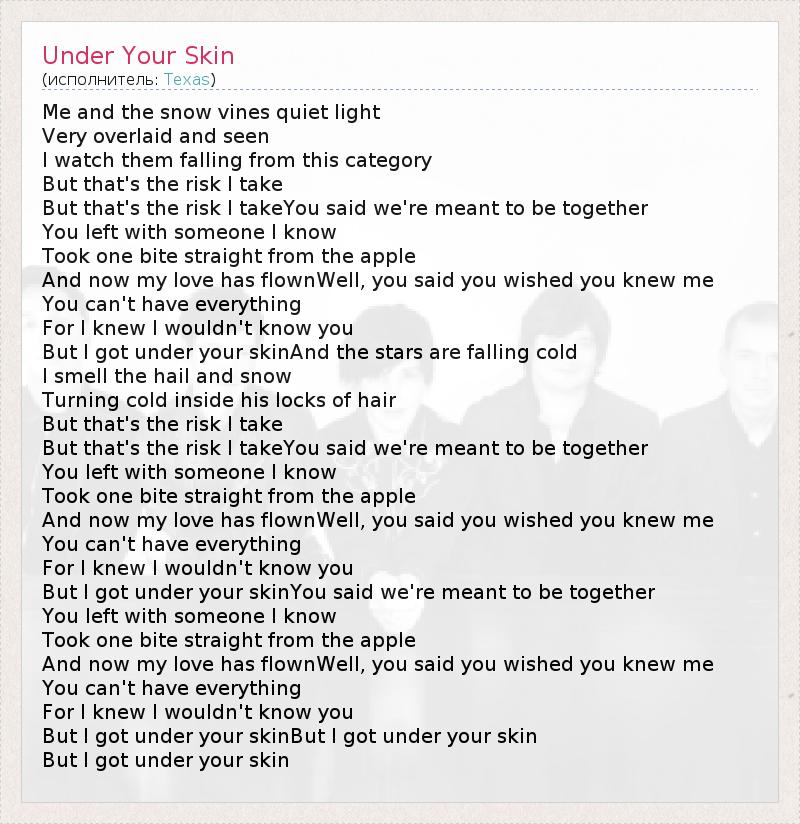 Me and the snow vines quiet light Very overlaid and seen I watch them falling from this category But that's the risk I take But that's the risk I takeYou said we're meant to be together You left with someone I know Took one bite straight from the apple And now my love has flownWell, you said you wished you knew me You can't have everything For I knew I wouldn't know you But I got under your skinAnd the stars are falling cold I smell the hail and snow Turning cold inside his locks of hair But that's the risk I take But that's the risk I takeYou said we're meant to be together You left with someone I know Took one bite straight from the apple And now my love has flownWell, you said you wished you knew me You can't have everything For I knew I wouldn't know you But I got under your skinYou said we're meant to be together You left with someone I know Took one bite straight from the apple And now my love has flownWell, you said you wished you knew me You can't have everything For I knew I wouldn't know you But I got under your skinBut I got under your skin But I got under your skin