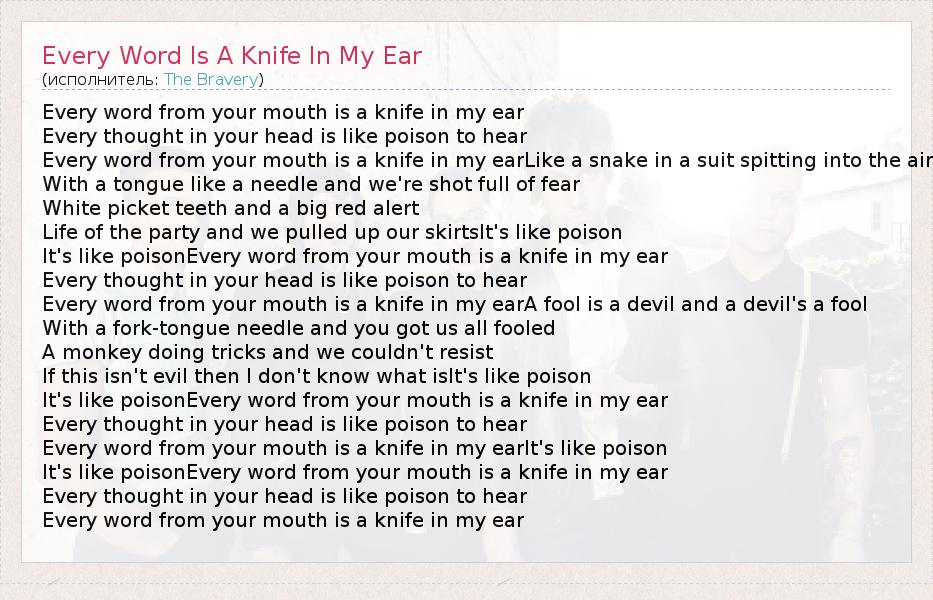 ГлавнаяИсполнителиThe BraveryEvery Word Is A Knife In My Ear