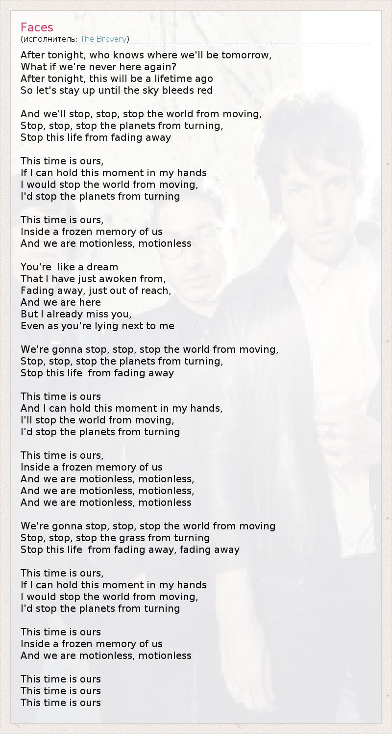 После сегодняшней ночи кто знает, где мы будем завтра ? А вдруг мы никогда больше не окажемся здесь ? После этой ночи всё будет, как в прошлой жизни, Так давай не будем спать, пока не заалеет рассвет И мы остановим, остановим, остановим этот мир, Остановим, остановим движение планет, Не дадим жизни исчезнуть Это время – наше, Если б я мог удержать этот момент в руке, Я бы остановил мир, Я бы остановил движение планет Это время – наше, Внутри нашей замерзшей памяти, А сами мы неподвижны, неподвижны Ты словно сон, От которого я только что проснулся, Ты ускользаешь, до тебя не дотянуться, Мы здесь, Но я уже скучаю по тебе, Хоть ты и лежишь рядом со мной И мы остановим, остановим, остановим этот мир, Остановим, остановим движение планет, Не дадим жизни исчезнуть Это время – наше, Если б я мог удержать этот момент в руке, Я бы остановил мир, Я бы остановил движение планет Это время – наше, Внутри нашей замерзшей памяти, А сами мы неподвижны, неподвижны, А сами мы неподвижны, неподвижны, А сами мы неподвижны, неподвижны И мы остановим, остановим, остановим этот мир, Остановим, остановим движение планет, Не дадим жизни исчезнуть Это время – наше, Если б я мог удержать этот момент в руке, Я бы остановил мир, Я бы остановил движение планет Это время – наше, Внутри нашей замерзшей памяти, А сами мы неподвижны, неподвижны Это время – наше, Это время – наше, Это время – наше