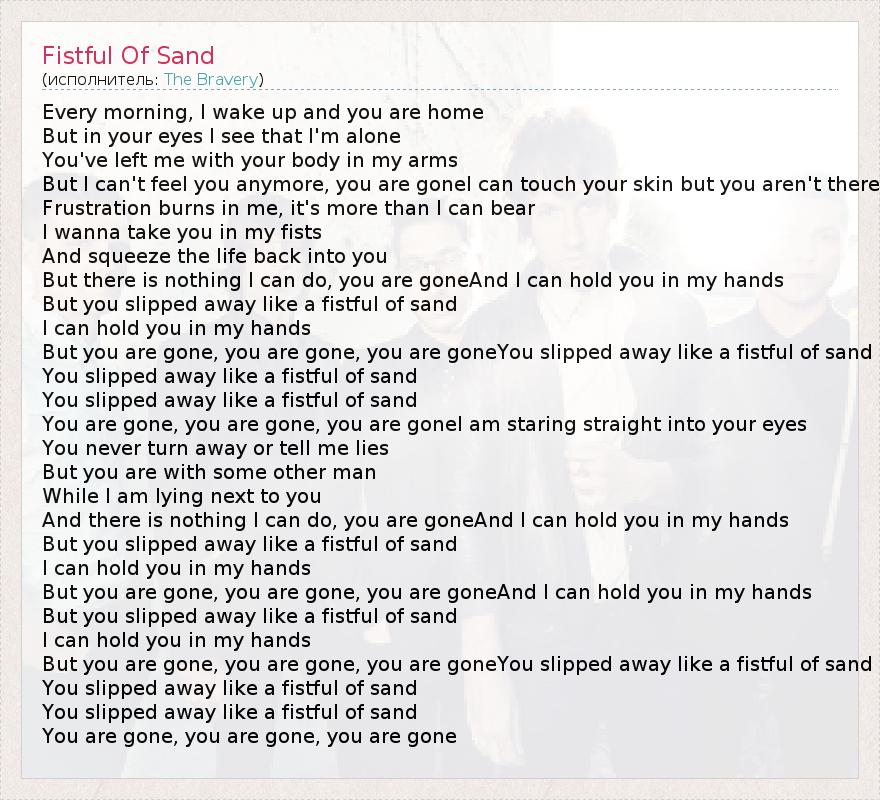 Every morning, I wake up and you are home But in your eyes I see that I'm alone You've left me with your body in my arms But I can't feel you anymore, you are goneI can touch your skin but you aren't there Frustration burns in me, it's more than I can bear I wanna take you in my fists And squeeze the life back into you But there is nothing I can do, you are goneAnd I can hold you in my hands But you slipped away like a fistful of sand I can hold you in my hands But you are gone, you are gone, you are goneYou slipped away like a fistful of sand You slipped away like a fistful of sand You slipped away like a fistful of sand You are gone, you are gone, you are goneI am staring straight into your eyes You never turn away or tell me lies But you are with some other man While I am lying next to you And there is nothing I can do, you are goneAnd I can hold you in my hands But you slipped away like a fistful of sand I can hold you in my hands But you are gone, you are gone, you are goneAnd I can hold you in my hands But you slipped away like a fistful of sand I can hold you in my hands But you are gone, you are gone, you are goneYou slipped away like a fistful of sand You slipped away like a fistful of sand You slipped away like a fistful of sand You are gone, you are gone, you are gone