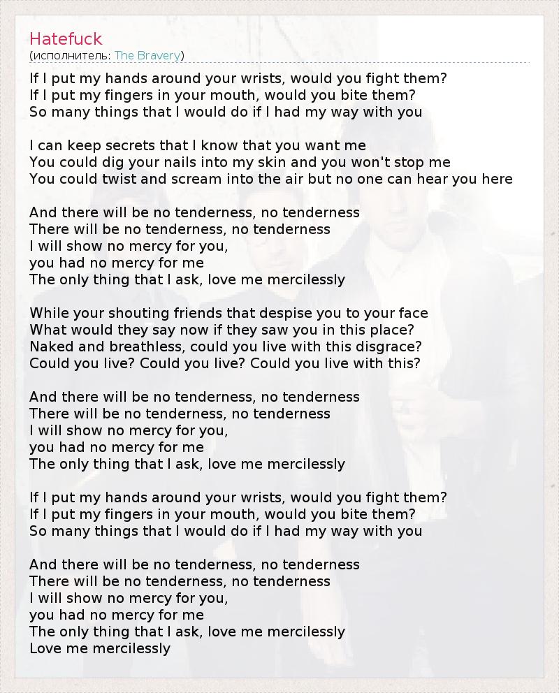 If I put my hands around your wrists, would you fight them? If I put my fingers in your mouth, would you bite them? So many things that I would do if I had my way with you I can keep secrets that I know that you want me You could dig your nails into my skin and you won't stop me You could twist and scream into the air but no one can hear you here And there will be no tenderness, no tenderness There will be no tenderness, no tenderness I will show no mercy for you, you had no mercy for me The only thing that I ask, love me mercilessly While your shouting friends that despise you to your face What would they say now if they saw you in this place? Naked and breathless, could you live with this disgrace? Could you live? Could you live? Could you live with this? And there will be no tenderness, no tenderness There will be no tenderness, no tenderness I will show no mercy for you, you had no mercy for me The only thing that I ask, love me mercilessly If I put my hands around your wrists, would you fight them? If I put my fingers in your mouth, would you bite them? So many things that I would do if I had my way with you And there will be no tenderness, no tenderness There will be no tenderness, no tenderness I will show no mercy for you, you had no mercy for me The only thing that I ask, love me mercilessly Love me mercilessly