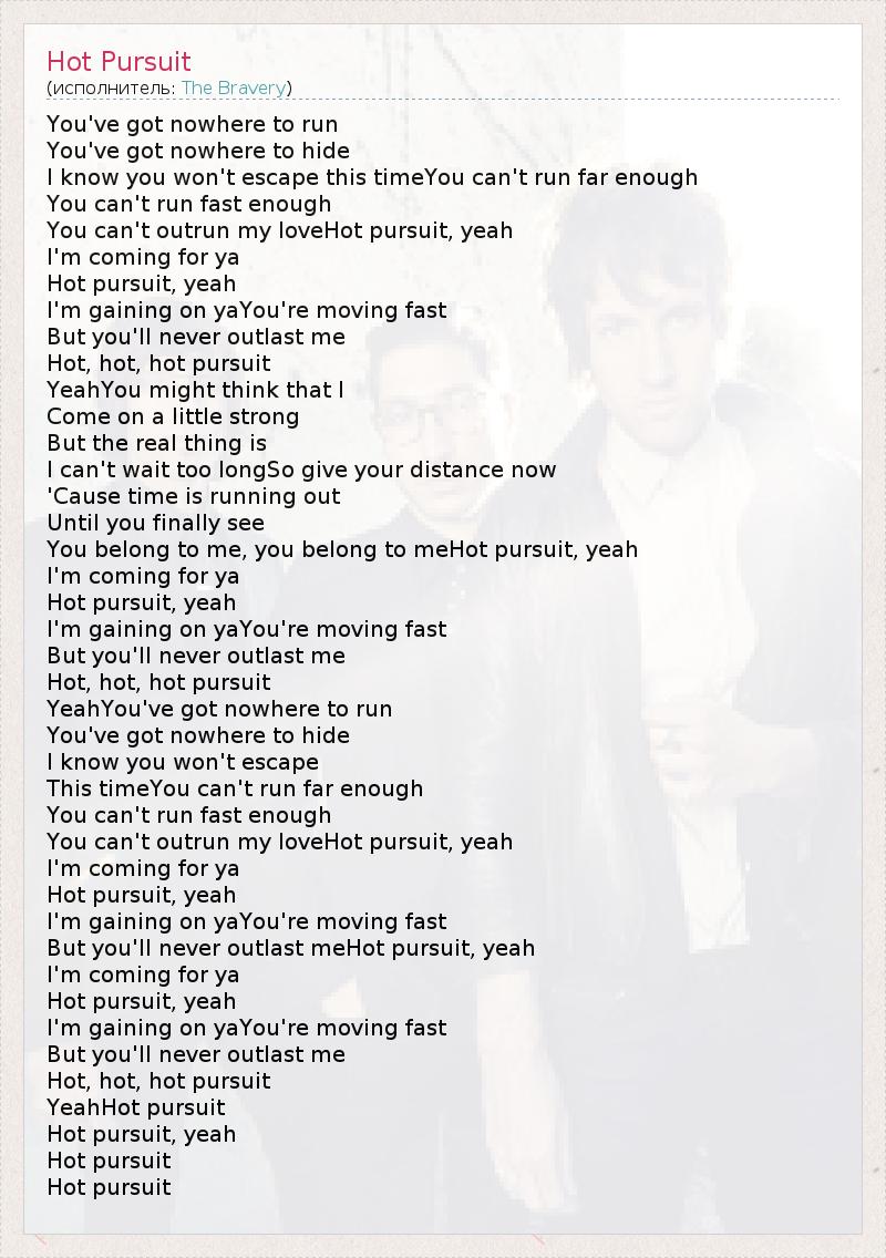 You've got nowhere to run You've got nowhere to hide I know you won't escape this timeYou can't run far enough You can't run fast enough You can't outrun my loveHot pursuit, yeah I'm coming for ya Hot pursuit, yeah I'm gaining on yaYou're moving fast But you'll never outlast me Hot, hot, hot pursuit YeahYou might think that I Come on a little strong But the real thing is I can't wait too longSo give your distance now 'Cause time is running out Until you finally see You belong to me, you belong to meHot pursuit, yeah I'm coming for ya Hot pursuit, yeah I'm gaining on yaYou're moving fast But you'll never outlast me Hot, hot, hot pursuit YeahYou've got nowhere to run You've got nowhere to hide I know you won't escape This timeYou can't run far enough You can't run fast enough You can't outrun my loveHot pursuit, yeah I'm coming for ya Hot pursuit, yeah I'm gaining on yaYou're moving fast But you'll never outlast meHot pursuit, yeah I'm coming for ya Hot pursuit, yeah I'm gaining on yaYou're moving fast But you'll never outlast me Hot, hot, hot pursuit YeahHot pursuit Hot pursuit, yeah Hot pursuit Hot pursuit
