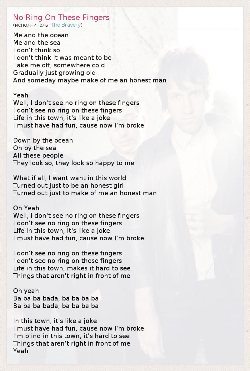 Me and the ocean Me and the sea I don't think so I don't think it was meant to be Take me off, somewhere cold Gradually just growing old And someday maybe make of me an honest man Yeah Well, I don't see no ring on these fingers I don't see no ring on these fingers Life in this town, it's like a joke I must have had fun, cause now I'm broke Down by the ocean Oh by the sea All these people They look so, they look so happy to me What if all, I want want in this world Turned out just to be an honest girl Turned out just to make of me an honest man Oh Yeah Well, I don't see no ring on these fingers I don't see no ring on these fingers Life in this town, it's like a joke I must have had fun, cause now I'm broke I don't see no ring on these fingers I don't see no ring on these fingers Life in this town, makes it hard to see Things that aren't right in front of me Oh yeah Ba ba ba bada, ba ba ba ba Ba ba ba bada, ba ba ba ba In this town, it's like a joke I must have had fun, cause now I'm broke I'm blind in this town, it's hard to see Things that aren't right in front of me Yeah