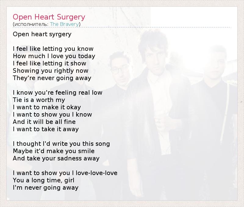 Операция на открытом сердце Я испытываю желание сообщить Насколько я люблю тебя сегодня. Я испытываю желание это показать, Показать тебе правильно теперь. Они никогда не уходят. Я знаю, что ты в депрессии, Наша связь - ценность для меня. Я хочу сделать, чтобы было хорошо. Я хочу показать тебе, я знаю - Всё будет прекрасно. Я хочу убрать это (прим. пер.: имеется в виду, депрессию). Я думал написать для тебя эту песню. Возможно, это заставило бы тебя улыбнуться. Прогони свою печаль. Я хочу показать тебе: я люблю - люблю -люблю Тебя долгое время, девочка. Я никогда не уйду.