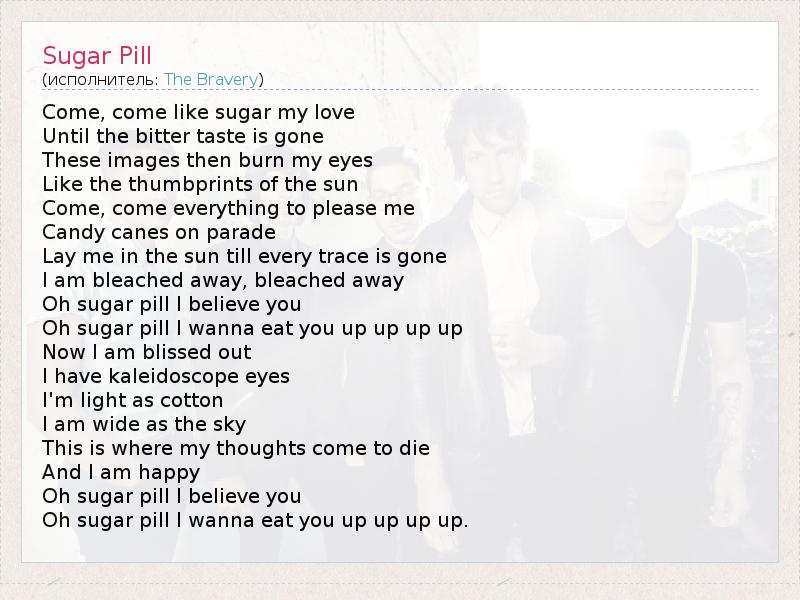 Come, come like sugar my love Until the bitter taste is gone These images then burn my eyes Like the thumbprints of the sun Come, come everything to please me Candy canes on parade Lay me in the sun till every trace is gone I am bleached away, bleached away Oh sugar pill I believe you Oh sugar pill I wanna eat you up up up up Now I am blissed out I have kaleidoscope eyes I'm light as cotton I am wide as the sky This is where my thoughts come to die And I am happy Oh sugar pill I believe you Oh sugar pill I wanna eat you up up up up.