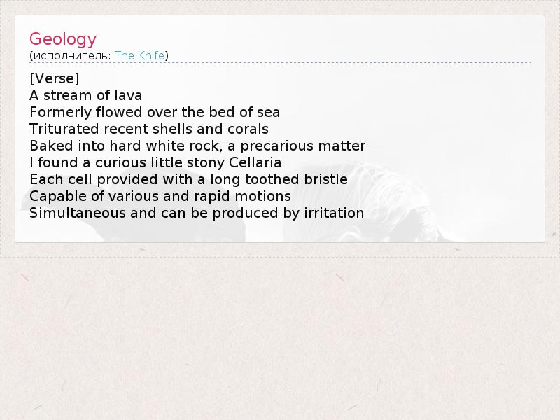 [Verse] A stream of lava Formerly flowed over the bed of sea Triturated recent shells and corals Baked into hard white rock, a precarious matter I found a curious little stony Cellaria Each cell provided with a long toothed bristle Capable of various and rapid motions Simultaneous and can be produced by irritation
