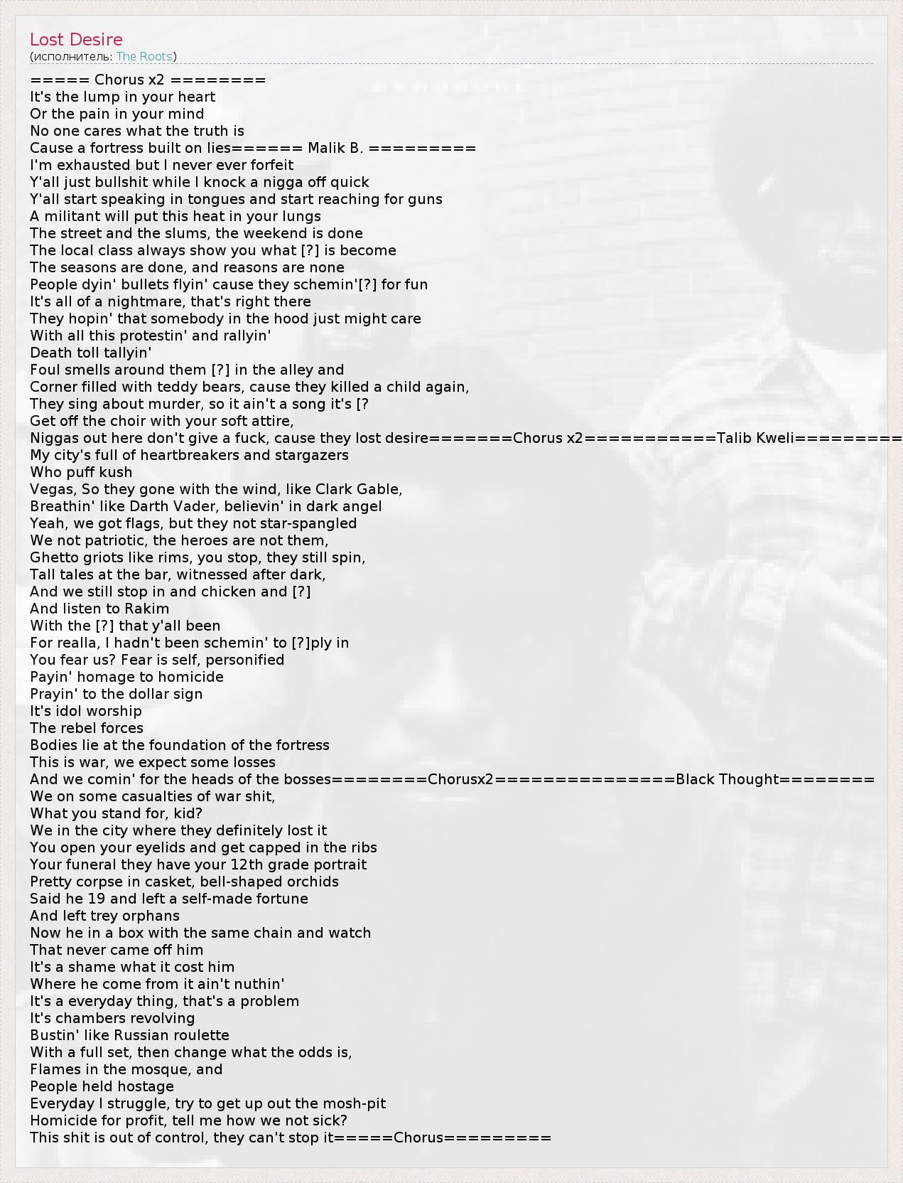 ===== Chorus x2 ======== It's the lump in your heart Or the pain in your mind No one cares what the truth is Cause a fortress built on lies====== Malik B. ========= I'm exhausted but I never ever forfeit Y'all just bullshit while I knock a nigga off quick Y'all start speaking in tongues and start reaching for guns A militant will put this heat in your lungs The street and the slums, the weekend is done The local class always show you what [?] is become The seasons are done, and reasons are none People dyin' bullets flyin' cause they schemin'[?] for fun It's all of a nightmare, that's right there They hopin' that somebody in the hood just might care With all this protestin' and rallyin' Death toll tallyin' Foul smells around them [?] in the alley and Corner filled with teddy bears, cause they killed a child again, They sing about murder, so it ain't a song it's [? Get off the choir with your soft attire, Niggas out here don't give a fuck, cause they lost desire=======Chorus x2===========Talib Kweli========= My city's full of heartbreakers and stargazers Who puff kush Vegas, So they gone with the wind, like Clark Gable, Breathin' like Darth Vader, believin' in dark angel Yeah, we got flags, but they not star-spangled We not patriotic, the heroes are not them, Ghetto griots like rims, you stop, they still spin, Tall tales at the bar, witnessed after dark, And we still stop in and chicken and [?] And listen to Rakim With the [?] that y'all been For realla, I hadn't been schemin' to [?]ply in You fear us? Fear is self, personified Payin' homage to homicide Prayin' to the dollar sign It's idol worship The rebel forces Bodies lie at the foundation of the fortress This is war, we expect some losses And we comin' for the heads of the bosses========Chorusx2===============Black Thought======== We on some casualties of war shit, What you stand for, kid? We in the city where they definitely lost it You open your eyelids and get capped in the ribs Your funeral they have your 12th grade portrait Pretty corpse in casket, bell-shaped orchids Said he 19 and left a self-made fortune And left trey orphans Now he in a box with the same chain and watch That never came off him It's a shame what it cost him Where he come from it ain't nuthin' It's a everyday thing, that's a problem It's chambers revolving Bustin' like Russian roulette With a full set, then change what the odds is, Flames in the mosque, and People held hostage Everyday I struggle, try to get up out the mosh-pit Homicide for profit, tell me how we not sick? This shit is out of control, they can't stop it=====Chorus=========