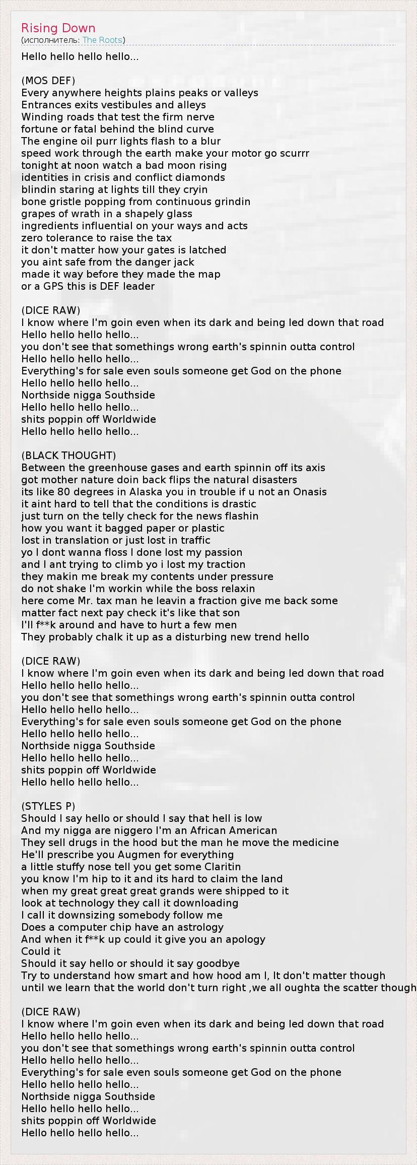 Привет привет привет привет ... ( Мос Деф ) Каждые высоты в любом месте равнины пики или долины Входы выходит вестибюли и переулки Извилистые дороги , которые проверяют твердую нерв состояние или смертельные за слепой кривой Мурлыканье огни моторное масло мигать, пятно скорость работы по земле сделать свой двигатель идут scurrr сегодня в полдень смотреть Bad Moon Rising тождества в кризисных и конфликтных алмазов blindin глядя на огни , пока они не плачут кости хрящ появляются от непрерывного Grindin Гроздья гнева в стройных стекла ингредиенты влиятельные в путь свой и актов нулевой терпимости повысить налог это не имеет значения , как ваши ворота фиксируется Вы не безопасно от гнезда опасности сделал это путь, прежде чем они сделали карту илиGPS это лидер DEF ( DICE RAW) Я знаю, где я иду , даже когда его темная и руководствуясь по этому пути Привет привет привет привет ... вы не видите , что нечто Spinnin контроль сбился не того Земли Привет привет привет привет ... Все в продаже даже души кто-то получить Бога по телефону Привет привет привет привет ... Нортсайд ниггер Southside Привет привет привет привет ... погано попсовое от всему миру Привет привет привет привет ... ( Black Thought ) Между парниковых газов и земли Spinnin со своей оси получил мать-природа делаешь сальто назад на стихийные бедствия ее как 80 градусов на Аляске вас в беде , если и неOnasis это не трудно сказать , что условия является резкое просто включите проверки телика на новости flashin как вы хотите мешки бумаги или пластика теряется в переводе или просто потеряли в движении лет я не хочу нить я сделал потерял страсть и я муравья пытался подняться лет я потерял свой сцепление они Макин меня сломать мои содержимое под давлением не трясите Я работаю в то время как босс релаксин сюда приезжают г-н налог человек, которого он оставляешь фракцию дать мне вернуть часть имеет значения факт следующая платить проверить это все равно, что сын Я ж ** к вокруг и болеть несколько мужчин Они, вероятно, приписывают его как тревожный новой тенденции привет ( DICE RAW) Я знаю, где я иду , даже когда его темная и руководствуясь по этому пути Привет привет привет привет ... вы не видите , что нечто Spinnin контроль сбился не того Земли Привет привет привет привет ... Все в продаже даже души кто-то получить Бога по телефону Привет привет привет привет ... Нортсайд ниггер Southside Привет привет привет привет ... погано попсовое от всему миру Привет привет привет привет ... ( Styles P ) Должен ли я сказать привет или я должен сказать , что , черт возьми, с низким И мой ниггер являются niggero Я афроамериканец Они продают наркотики в капюшоне , но человек он двигаться лекарство Он будет назначить вам Augmen за все немного заложен нос сказать вам получить кларитин вы знаете, я хип к нему и его трудно претендовать на землю когда мои великие великие великие гранды были отправлены к нему посмотреть на технологии они называют это скачивания Я называю это сокращение кто-то за мной Компьютерный чип Имеет ли астрология И когда это ж ** к до могло дать Вам извинения Может это Должна ли она поздороваться или же она должна попрощаться Постарайтесь понять , насколько умный и как капот я , это не имеет значения, хотя пока мы не узнаем, что мир не повернуть направо , мы все Oughta разброс , хотя ( DICE RAW) Я знаю, где я иду , даже когда его темная и руководствуясь по этому пути Привет привет привет приве