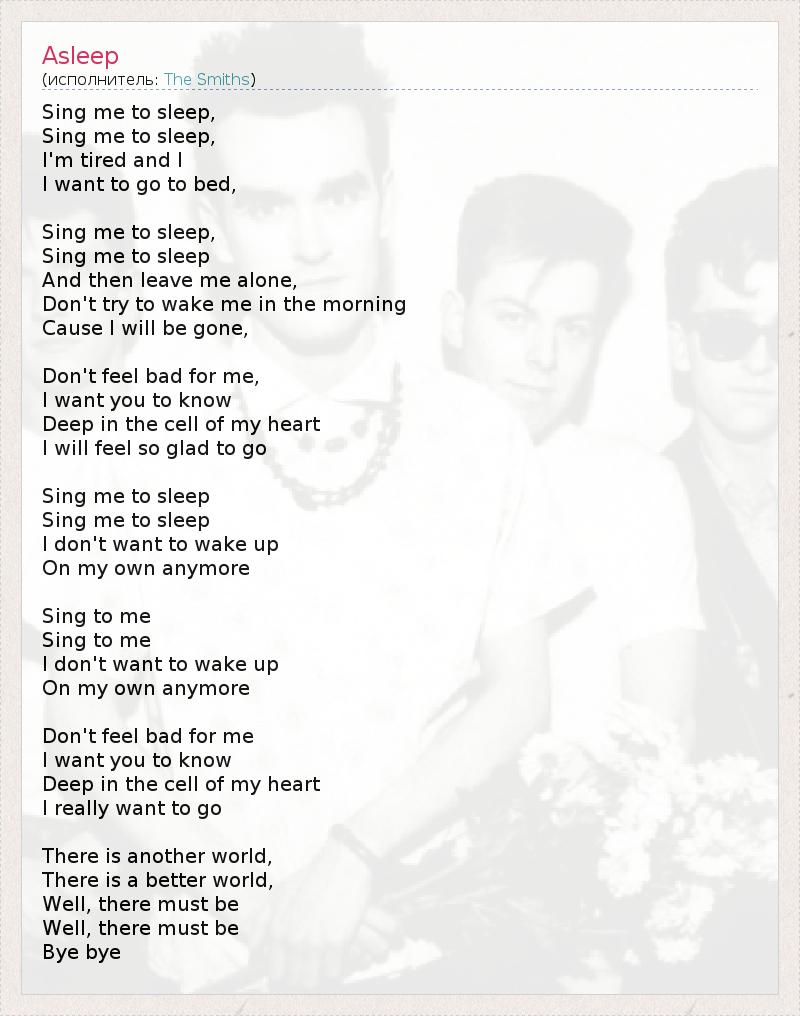 Спой мне, чтобы я уснул, Спой мне, чтобы я уснул, Я устал и Я хочу пойти спать, Спой мне, чтобы я уснул, Спой мне, чтобы я уснул, А затем оставь меня одного, Не пытайся разбудить меня утром, Ведь я уйду, Не переживай за меня Я хочу, чтобы ты знала: Глубоко в сердце Я буду рад, что уйду Спой мне, чтобы я уснул, Спой мне, чтобы я уснул, Я больше не хочу просыпаться Один никогда Спой мне, Спой мне, Я больше не хочу просыпаться Один никогда Не переживай за меня Я хочу, чтобы ты знала: Глубоко в сердце Я действительно хочу уйти Есть другой мир, Есть лучший мир, Что ж, это, наверно, Что ж, это, наверно, "Прощай!"