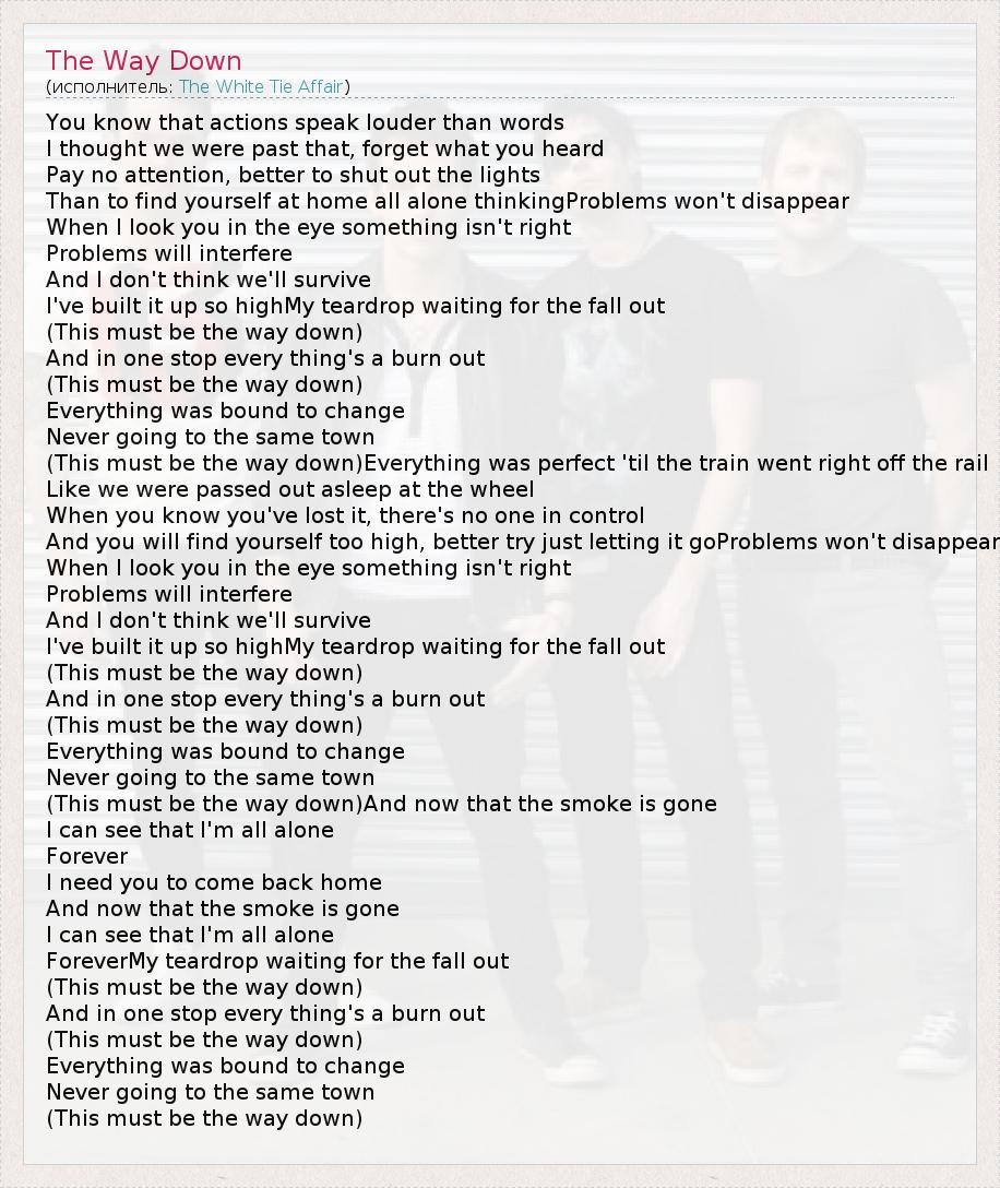 You know that actions speak louder than words I thought we were past that, forget what you heard Pay no attention, better to shut out the lights Than to find yourself at home all alone thinkingProblems won't disappear When I look you in the eye something isn't right Problems will interfere And I don't think we'll survive I've built it up so highMy teardrop waiting for the fall out (This must be the way down) And in one stop every thing's a burn out (This must be the way down) Everything was bound to change Never going to the same town (This must be the way down)Everything was perfect 'til the train went right off the rail Like we were passed out asleep at the wheel When you know you've lost it, there's no one in control And you will find yourself too high, better try just letting it goProblems won't disappear When I look you in the eye something isn't right Problems will interfere And I don't think we'll survive I've built it up so highMy teardrop waiting for the fall out (This must be the way down) And in one stop every thing's a burn out (This must be the way down) Everything was bound to change Never going to the same town (This must be the way down)And now that the smoke is gone I can see that I'm all alone Forever I need you to come back home And now that the smoke is gone I can see that I'm all alone ForeverMy teardrop waiting for the fall out (This must be the way down) And in one stop every thing's a burn out (This must be the way down) Everything was bound to change Never going to the same town (This must be the way down)