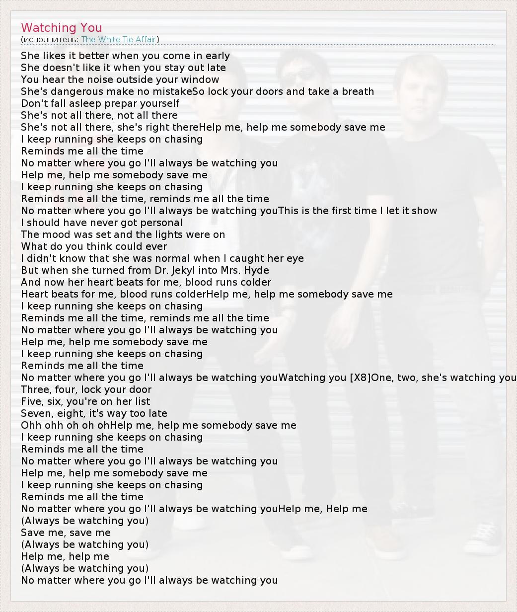 No matter where you go I'll always be watching youWatching you [X8]One, two, she's watching you