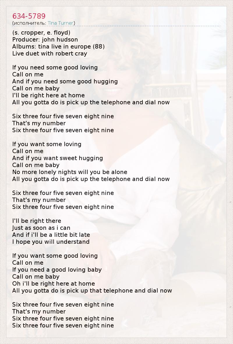 (s. cropper, e. floyd) Producer: john hudson Albums: tina live in europe (88) Live duet with robert cray If you need some good loving Call on me And if you need some good hugging Call on me baby I'll be right here at home All you gotta do is pick up the telephone and dial now Six three four five seven eight nine That's my number Six three four five seven eight nine If you want some loving Call on me And if you want sweet hugging Call on me baby No more lonely nights will you be alone All you gotta do is pick up the telephone and dial now Six three four five seven eight nine That's my number Six three four five seven eight nine I'll be right there Just as soon as i can And if i'll be a little bit late I hope you will understand If you want some good loving Call on me If you need a good loving baby Call on me baby Oh i'll be right here at home All you gotta do is pick up that telephone and dial now Six three four five seven eight nine That's my number Six three four five seven eight nine Six three four five seven eight nine