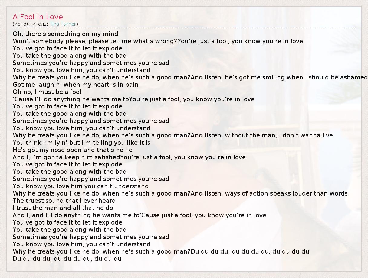 Oh, there's something on my mind Won't somebody please, please tell me what's wrong?You're just a fool, you know you're in love You've got to face it to let it explode You take the good along with the bad Sometimes you're happy and sometimes you're sad You know you love him, you can't understand Why he treats you like he do, when he's such a good man?And listen, he's got me smiling when I should be ashamed Got me laughin' when my heart is in pain Oh no, I must be a fool 'Cause I'll do anything he wants me toYou're just a fool, you know you're in love You've got to face it to let it explode You take the good along with the bad Sometimes you're happy and sometimes you're sad You know you love him, you can't understand Why he treats you like he do, when he's such a good man?And listen, without the man, I don't wanna live You think I'm lyin' but I'm telling you like it is He's got my nose open and that's no lie And I, I'm gonna keep him satisfiedYou're just a fool, you know you're in love You've got to face it to let it explode You take the good along with the bad Sometimes you're happy and sometimes you're sad You know you love him you can't understand Why he treats you like he do, when he's such a good man?And listen, ways of action speaks louder than words The truest sound that I ever heard I trust the man and all that he do And I, and I'll do anything he wants me to'Cause just a fool, you know you're in love You've got to face it to let it explode You take the good along with the bad Sometimes you're happy and sometimes you're sad You know you love him, you can't understand Why he treats you like he do, when he's such a good man?Du du du du, du du du du, du du du du Du du du du, du du du du, du du du
