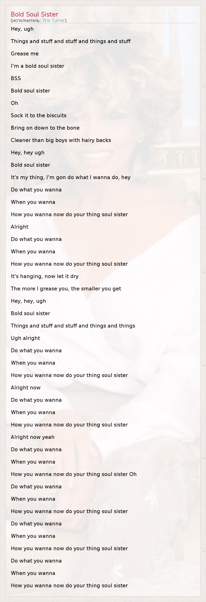 Hey, ugh Things and stuff and stuff and things and stuff Grease me I'm a bold soul sister BSS Bold soul sister Oh Sock it to the biscuits Bring on down to the bone Cleaner than big boys with hairy backs Hey, hey ugh Bold soul sister It's my thing, I'm gon do what I wanna do, hey Do what you wanna When you wanna How you wanna now do your thing soul sister Alright Do what you wanna When you wanna How you wanna now do your thing soul sister It's hanging, now let it dry The more I grease you, the smaller you get Hey, hey, ugh Bold soul sister Things and stuff and stuff and things and things Ugh alright Do what you wanna When you wanna How you wanna now do your thing soul sister Alright now Do what you wanna When you wanna How you wanna now do your thing soul sister Alright now yeah Do what you wanna When you wanna How you wanna now do your thing soul sister Oh Do what you wanna When you wanna How you wanna now do your thing soul sister Do what you wanna When you wanna How you wanna now do your thing soul sister Do what you wanna When you wanna How you wanna now do your thing soul sister