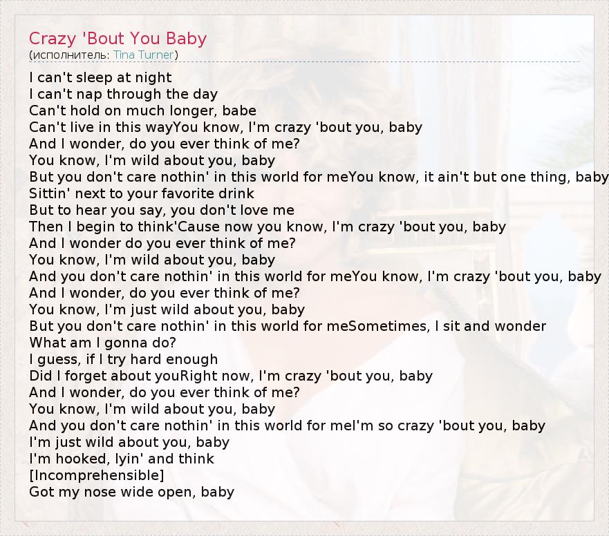 I can't sleep at night I can't nap through the day Can't hold on much longer, babe Can't live in this wayYou know, I'm crazy 'bout you, baby And I wonder, do you ever think of me? You know, I'm wild about you, baby But you don't care nothin' in this world for meYou know, it ain't but one thing, baby Sittin' next to your favorite drink But to hear you say, you don't love me Then I begin to think'Cause now you know, I'm crazy 'bout you, baby And I wonder do you ever think of me? You know, I'm wild about you, baby And you don't care nothin' in this world for meYou know, I'm crazy 'bout you, baby And I wonder, do you ever think of me? You know, I'm just wild about you, baby But you don't care nothin' in this world for meSometimes, I sit and wonder What am I gonna do? I guess, if I try hard enough Did I forget about youRight now, I'm crazy 'bout you, baby And I wonder, do you ever think of me? You know, I'm wild about you, baby And you don't care nothin' in this world for meI'm so crazy 'bout you, baby I'm just wild about you, baby I'm hooked, lyin' and think [Incomprehensible] Got my nose wide open, baby
