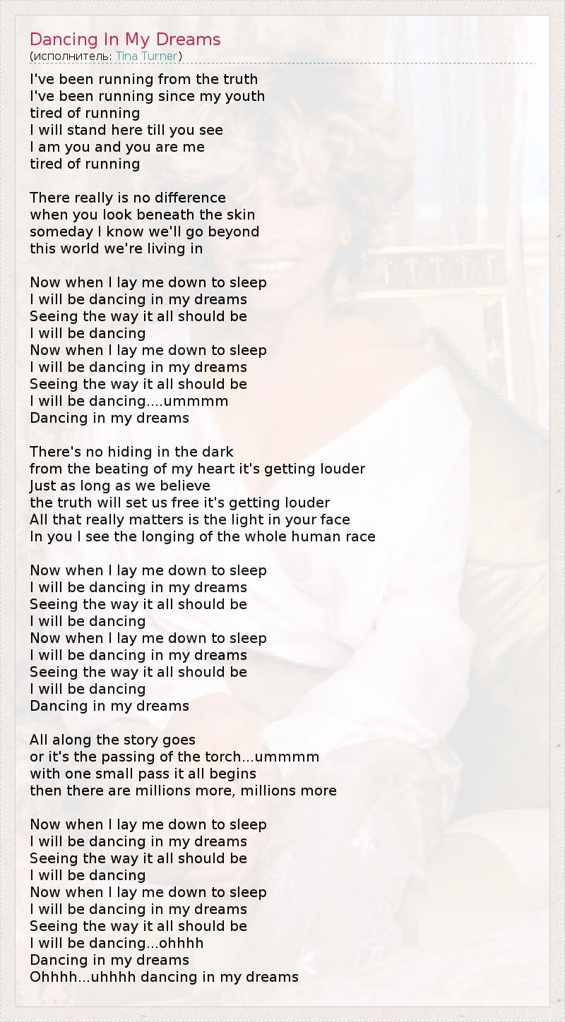 Я бежала от правды, Я бежала от неё начиная с юных лет, Устав бежать, Я буду стоять здесь до тех пор, пока ты не увидишь, Что я - это ты, а ты - это я, Уставшая бежать. В действительности нет никакой разницы, Когда ты видишь человека насквозь. Я знаю, когда-нибудь мы выйдем из границ Того мира, в котором живём. Теперь, когда я ложусь спать, В своих снах я буду танцевать, Поскольку, так всё и должно быть, Я буду танцевать. Теперь, когда я ложусь спать, В своих снах я буду танцевать, Поскольку, так всё и должно быть, Я буду танцевать... хмммм, Тацевать в своих снах. Невозможно спрятаться в темноте От стука моего сердца, оно стучит громче. До тех пор, пока мы верим, Что правда сделает нас свободными, моё сердце стучит сильнее. Все, что действительно имеет значение, это свет, исходящий от тебя. На твоём лице я вижу тоску всего человеческого рода. Теперь, когда я ложусь спать, В своих снах я буду танцевать, Поскольку, так всё и должно быть, Я буду танцевать. Теперь, когда я ложусь спать, В своих снах я буду танцевать, Поскольку, так всё и должно быть, Я буду танцевать, Тацевать в своих снах. Всё идёт своим чередом, история продолжается, Или же это эстафета... хммм, С голубого ручейка начинается река, И потом всё увеличивается на миллионы, больше чем на миллионы. Теперь, когда я ложусь спать, В своих снах я буду танцевать, Поскольку, так всё и должно быть, Я буду танцевать. Теперь, когда я ложусь спать, В своих снах я буду танцевать, Поскольку, так всё и должно быть, Я буду танцевать, Тацевать в своих снах, О-о-о...у-у-у, танцевать в своих снах.