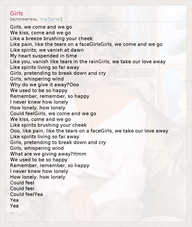 Girls, we come and we go We kiss, come and we go Like a breeze brushing your cheek Like pain, like the tears on a faceGirlsGirls, we come and we go Like spirits, we vanish at dawn My heart suspended in time Like you, vanish like tears in the rainGirls, we take our love away Like spirits living so far away Girls, pretending to break down and cry Girls, whispering wind Why do we give it away?Ooo We used to be so happy Remember, remember, so happy I never knew how lonely How lonely, how lonely Could feelGirls, we come and we go We kiss, come and we go Like spirits brushing your cheek Ooo, like pain, like the tears on a faceGirls, we take our love away Like spirits living so far away Girls, pretending to break down and cry Girls, whispering wind What are we giving away?Hmm We used to be so happy Remember, remember, so happy I never knew how lonely How lonely, how lonely Could feel Could feel Could feelYea Yea Yea ...