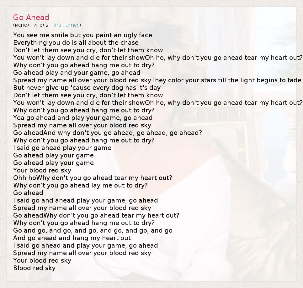 You see me smile but you paint an ugly face Everything you do is all about the chase Don't let them see you cry, don't let them know You won't lay down and die for their showOh ho, why don't you go ahead tear my heart out? Why don't you go ahead hang me out to dry? Go ahead play and your game, go ahead Spread my name all over your blood red skyThey color your stars till the light begins to fade But never give up 'cause every dog has it's day Don't let them see you cry, don't let them know You won't lay down and die for their showOh ho, why don't you go ahead tear my heart out? Why don't you go ahead hang me out to dry? Yea go ahead and play your game, go ahead Spread my name all over your blood red sky Go aheadAnd why don't you go ahead, go ahead, go ahead? Why don't you go ahead hang me out to dry? I said go ahead play your game Go ahead play your game Go ahead play your game Your blood red sky Ohh hoWhy don't you go ahead tear my heart out? Why don't you go ahead lay me out to dry? Go ahead I said go and ahead play your game, go ahead Spread my name all over your blood red sky Go aheadWhy don't you go ahead tear my heart out? Why don't you go ahead hang me out to dry? Go and go, and go, and go, and go, and go, and go And go ahead and hang my heart out I said go ahead and play your game, go ahead Spread my name all over your blood red sky Your blood red sky Blood red sky