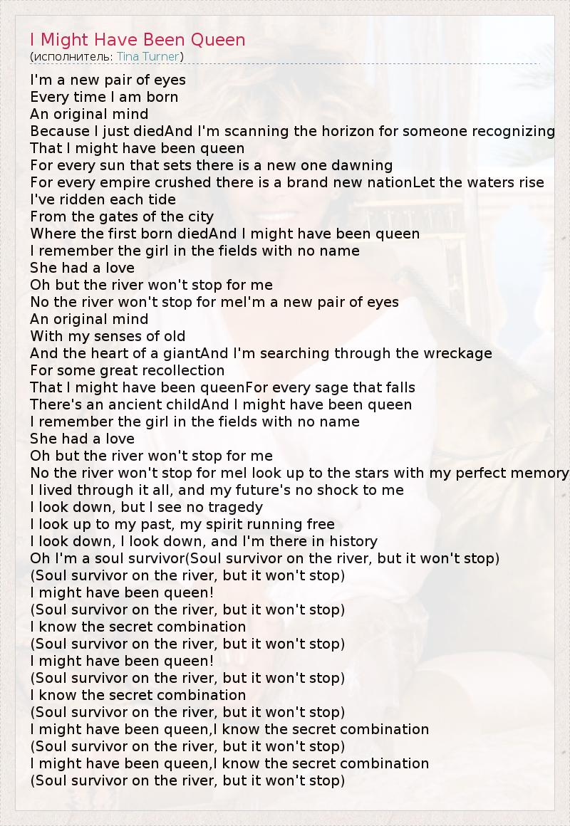 I'm a new pair of eyes Every time I am born An original mind Because I just diedAnd I'm scanning the horizon for someone recognizing That I might have been queen For every sun that sets there is a new one dawning For every empire crushed there is a brand new nationLet the waters rise I've ridden each tide From the gates of the city Where the first born diedAnd I might have been queen I remember the girl in the fields with no name She had a love Oh but the river won't stop for me No the river won't stop for meI'm a new pair of eyes An original mind With my senses of old And the heart of a giantAnd I'm searching through the wreckage For some great recollection That I might have been queenFor every sage that falls There's an ancient childAnd I might have been queen I remember the girl in the fields with no name She had a love Oh but the river won't stop for me No the river won't stop for meI look up to the stars with my perfect memory I lived through it all, and my future's no shock to me I look down, but I see no tragedy I look up to my past, my spirit running free I look down, I look down, and I'm there in history Oh I'm a soul survivor(Soul survivor on the river, but it won't stop) (Soul survivor on the river, but it won't stop) I might have been queen! (Soul survivor on the river, but it won't stop) I know the secret combination (Soul survivor on the river, but it won't stop) I might have been queen! (Soul survivor on the river, but it won't stop) I know the secret combination (Soul survivor on the river, but it won't stop) I might have been queen,I know the secret combination (Soul survivor on the river, but it won't stop) I might have been queen,I know the secret combination (Soul survivor on the river, but it won't stop)