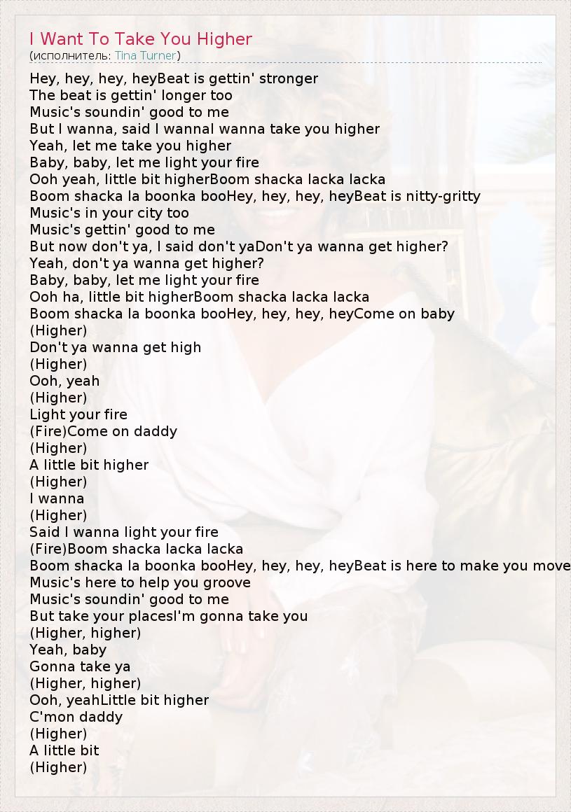 Hey, hey, hey, heyBeat is gettin' stronger The beat is gettin' longer too Music's soundin' good to me But I wanna, said I wannaI wanna take you higher Yeah, let me take you higher Baby, baby, let me light your fire Ooh yeah, little bit higherBoom shacka lacka lacka Boom shacka la boonka booHey, hey, hey, heyBeat is nitty-gritty Music's in your city too Music's gettin' good to me But now don't ya, I said don't yaDon't ya wanna get higher? Yeah, don't ya wanna get higher? Baby, baby, let me light your fire Ooh ha, little bit higherBoom shacka lacka lacka Boom shacka la boonka booHey, hey, hey, heyCome on baby (Higher) Don't ya wanna get high (Higher) Ooh, yeah (Higher) Light your fire (Fire)Come on daddy (Higher) A little bit higher (Higher) I wanna (Higher) Said I wanna light your fire (Fire)Boom shacka lacka lacka Boom shacka la boonka booHey, hey, hey, heyBeat is here to make you move Music's here to help you groove Music's soundin' good to me But take your placesI'm gonna take you (Higher, higher) Yeah, baby Gonna take ya (Higher, higher) Ooh, yeahLittle bit higher C'mon daddy (Higher) A little bit (Higher)