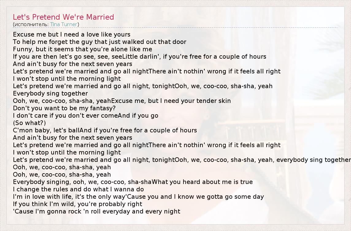 Excuse me but I need a love like yours To help me forget the guy that just walked out that door Funny, but it seems that you're alone like me If you are then let's go see, see, seeLittle darlin', if you're free for a couple of hours And ain't busy for the next seven years Let's pretend we're married and go all nightThere ain't nothin' wrong if it feels all right I won't stop until the morning light Let's pretend we're married and go all night, tonightOoh, we, coo-coo, sha-sha, yeah Everybody sing together Ooh, we, coo-coo, sha-sha, yeahExcuse me, but I need your tender skin Don't you want to be my fantasy? I don't care if you don't ever comeAnd if you go (So what?) C'mon baby, let's ballAnd if you're free for a couple of hours And ain't busy for the next seven years Let's pretend we're married and go all nightThere ain't nothin' wrong if it feels all right I won't stop until the morning light Let's pretend we're married and go all night, tonightOoh, we, coo-coo, sha-sha, yeah, everybody sing together Ooh, we, coo-coo, sha-sha, yeah Ooh, we, coo-coo, sha-sha, yeah Everybody singing, ooh, we, coo-coo, sha-shaWhat you heard about me is true I change the rules and do what I wanna do I'm in love with life, it's the only way'Cause you and I know we gotta go some day If you think I'm wild, you're probably right 'Cause I'm gonna rock 'n roll everyday and every night