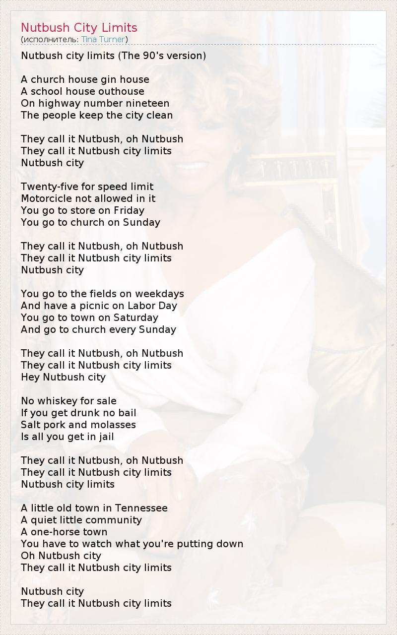 Nutbush city limits (The 90's version) A church house gin house A school house outhouse On highway number nineteen The people keep the city clean They call it Nutbush, oh Nutbush They call it Nutbush city limits Nutbush city Twenty-five for speed limit Motorcicle not allowed in it You go to store on Friday You go to church on Sunday They call it Nutbush, oh Nutbush They call it Nutbush city limits Nutbush city You go to the fields on weekdays And have a picnic on Labor Day You go to town on Saturday And go to church every Sunday They call it Nutbush, oh Nutbush They call it Nutbush city limits Hey Nutbush city No whiskey for sale If you get drunk no bail Salt pork and molasses Is all you get in jail They call it Nutbush, oh Nutbush They call it Nutbush city limits Nutbush city limits A little old town in Tennessee A quiet little community A one-horse town You have to watch what you're putting down Oh Nutbush city They call it Nutbush city limits Nutbush city They call it Nutbush city limits