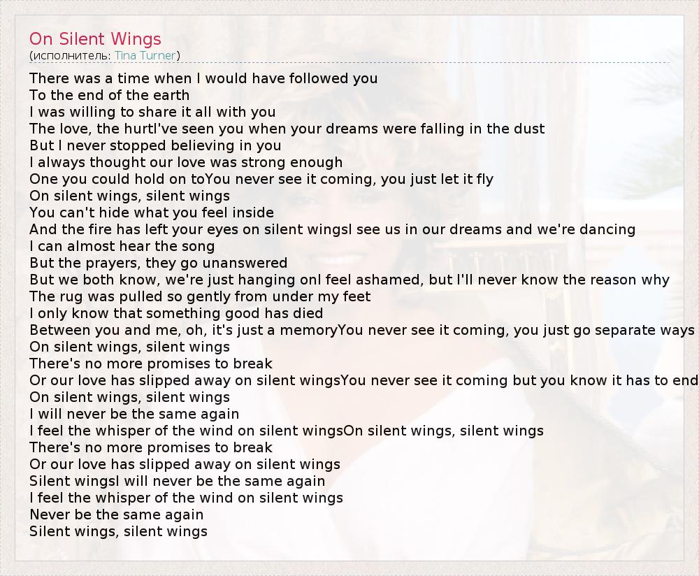 There was a time when I would have followed you To the end of the earth I was willing to share it all with you The love, the hurtI've seen you when your dreams were falling in the dust But I never stopped believing in you I always thought our love was strong enough One you could hold on toYou never see it coming, you just let it fly On silent wings, silent wings You can't hide what you feel inside And the fire has left your eyes on silent wingsI see us in our dreams and we're dancing I can almost hear the song But the prayers, they go unanswered But we both know, we're just hanging onI feel ashamed, but I'll never know the reason why The rug was pulled so gently from under my feet I only know that something good has died Between you and me, oh, it's just a memoryYou never see it coming, you just go separate ways On silent wings, silent wings There's no more promises to break Or our love has slipped away on silent wingsYou never see it coming but you know it has to end On silent wings, silent wings I will never be the same again I feel the whisper of the wind on silent wingsOn silent wings, silent wings There's no more promises to break Or our love has slipped away on silent wings Silent wingsI will never be the same again I feel the whisper of the wind on silent wings Never be the same again Silent wings, silent wings