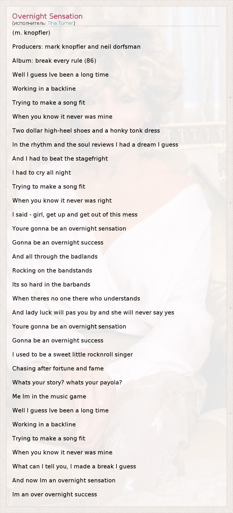 (m. knopfler) Producers: mark knopfler and neil dorfsman Album: break every rule (86) Well I guess Ive been a long time Working in a backline Trying to make a song fit When you know it never was mine Two dollar high-heel shoes and a honky tonk dress In the rhythm and the soul reviews I had a dream I guess And I had to beat the stagefright I had to cry all night Trying to make a song fit When you know it never was right I said - girl, get up and get out of this mess Youre gonna be an overnight sensation Gonna be an overnight success And all through the badlands Rocking on the bandstands Its so hard in the barbands When theres no one there who understands And lady luck will pas you by and she will never say yes Youre gonna be an overnight sensation Gonna be an overnight success I used to be a sweet little rocknroll singer Chasing after fortune and fame Whats your story? whats your payola? Me Im in the music game Well I guess Ive been a long time Working in a backline Trying to make a song fit When you know it never was mine What can I tell you, I made a break I guess And now Im an overnight sensation Im an over overnight success