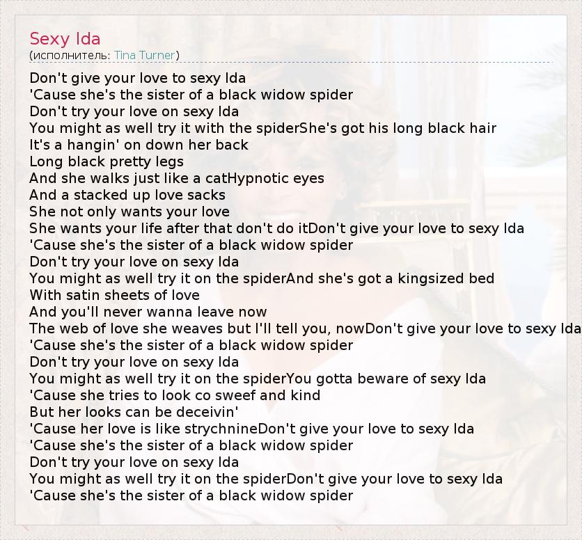 Don't give your love to sexy Ida 'Cause she's the sister of a black widow spider Don't try your love on sexy Ida You might as well try it with the spiderShe's got his long black hair It's a hangin' on down her back Long black pretty legs And she walks just like a catHypnotic eyes And a stacked up love sacks She not only wants your love She wants your life after that don't do itDon't give your love to sexy Ida 'Cause she's the sister of a black widow spider Don't try your love on sexy Ida You might as well try it on the spiderAnd she's got a kingsized bed With satin sheets of love And you'll never wanna leave now The web of love she weaves but I'll tell you, nowDon't give your love to sexy Ida 'Cause she's the sister of a black widow spider Don't try your love on sexy Ida You might as well try it on the spiderYou gotta beware of sexy Ida 'Cause she tries to look co sweef and kind But her looks can be deceivin' 'Cause her love is like strychnineDon't give your love to sexy Ida 'Cause she's the sister of a black widow spider Don't try your love on sexy Ida You might as well try it on the spiderDon't give your love to sexy Ida 'Cause she's the sister of a black widow spider