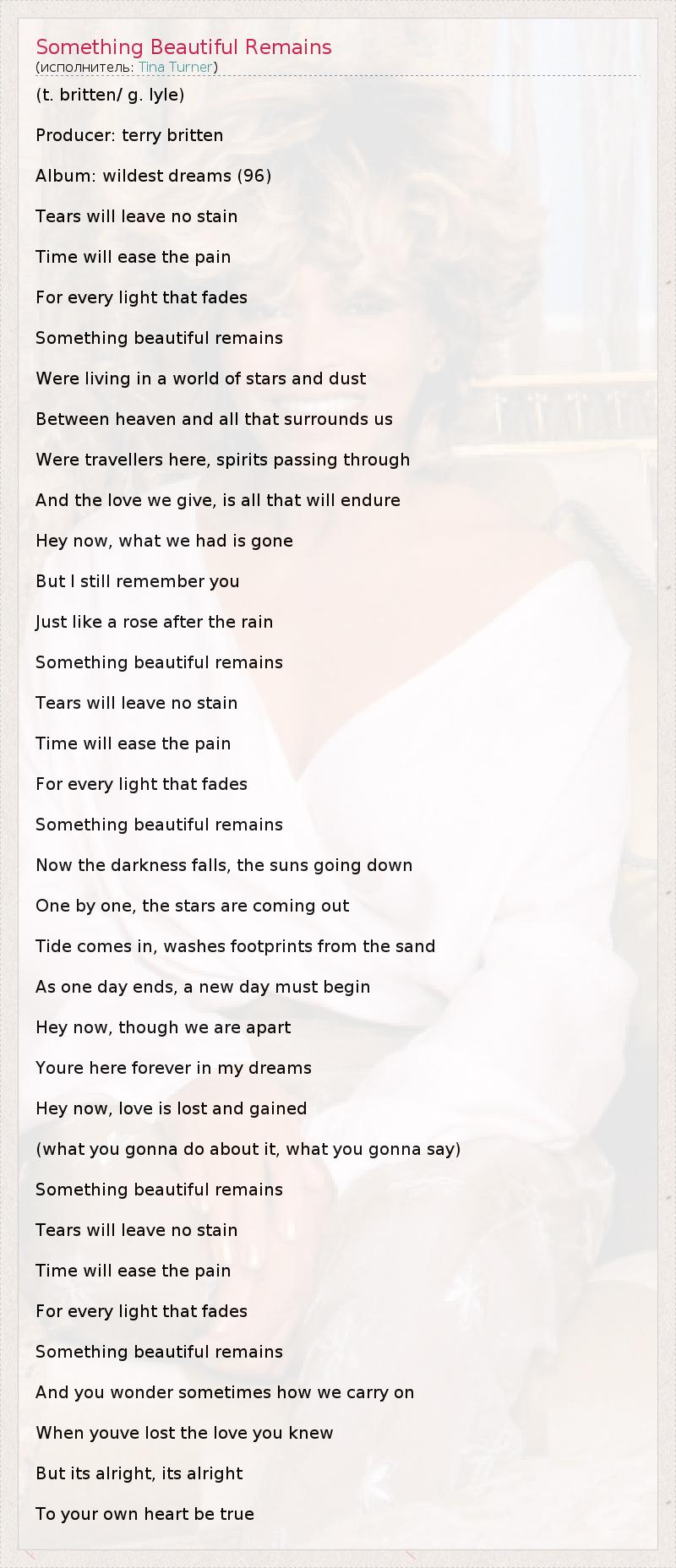 (t. britten/ g. lyle) Producer: terry britten Album: wildest dreams (96) Tears will leave no stain Time will ease the pain For every light that fades Something beautiful remains Were living in a world of stars and dust Between heaven and all that surrounds us Were travellers here, spirits passing through And the love we give, is all that will endure Hey now, what we had is gone But I still remember you Just like a rose after the rain Something beautiful remains Tears will leave no stain Time will ease the pain For every light that fades Something beautiful remains Now the darkness falls, the suns going down One by one, the stars are coming out Tide comes in, washes footprints from the sand As one day ends, a new day must begin Hey now, though we are apart Youre here forever in my dreams Hey now, love is lost and gained (what you gonna do about it, what you gonna say) Something beautiful remains Tears will leave no stain Time will ease the pain For every light that fades Something beautiful remains And you wonder sometimes how we carry on When youve lost the love you knew But its alright, its alright To your own heart be true