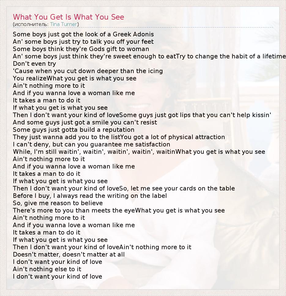 Some boys just got the look of a Greek Adonis An' some boys just try to talk you off your feet Some boys think they're Gods gift to woman An' some boys just think they're sweet enough to eatTry to change the habit of a lifetime Don't even try 'Cause when you cut down deeper than the icing You realizeWhat you get is what you see Ain't nothing more to it And if you wanna love a woman like me It takes a man to do it If what you get is what you see Then I don't want your kind of loveSome guys just got lips that you can't help kissin' And some guys just got a smile you can't resist Some guys just gotta build a reputation They just wanna add you to the listYou got a lot of physical attraction I can't deny, but can you guarantee me satisfaction While, I'm still waitin', waitin', waitin', waitin', waitinWhat you get is what you see Ain't nothing more to it And if you wanna love a woman like me It takes a man to do it If what you get is what you see Then I don't want your kind of loveSo, let me see your cards on the table Before I buy, I always read the writing on the label So, give me reason to believe There's more to you than meets the eyeWhat you get is what you see Ain't nothing more to it And if you wanna love a woman like me It takes a man to do it If what you get is what you see Then I don't want your kind of loveAin't nothing more to it Doesn't matter, doesn't matter at all I don't want your kind of love Ain't nothing else to it I don't want your kind of love