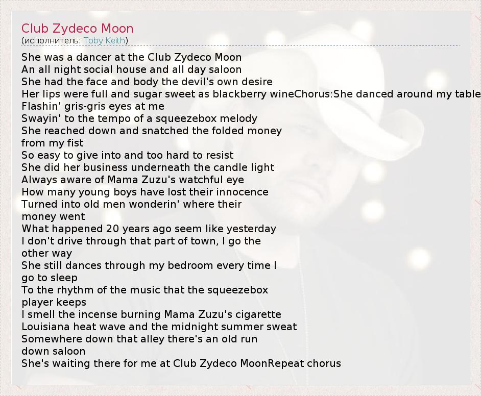 She was a dancer at the Club Zydeco Moon An all night social house and all day saloon She had the face and body the devil's own desire Her lips were full and sugar sweet as blackberry wineChorus:She danced around my table Flashin' gris-gris eyes at me Swayin' to the tempo of a squeezebox melody She reached down and snatched the folded money from my fist So easy to give into and too hard to resist She did her business underneath the candle light Always aware of Mama Zuzu's watchful eye How many young boys have lost their innocence Turned into old men wonderin' where their money went What happened 20 years ago seem like yesterday I don't drive through that part of town, I go the other way She still dances through my bedroom every time I go to sleep To the rhythm of the music that the squeezebox player keeps I smell the incense burning Mama Zuzu's cigarette Louisiana heat wave and the midnight summer sweat Somewhere down that alley there's an old run down saloon She's waiting there for me at Club Zydeco MoonRepeat chorus