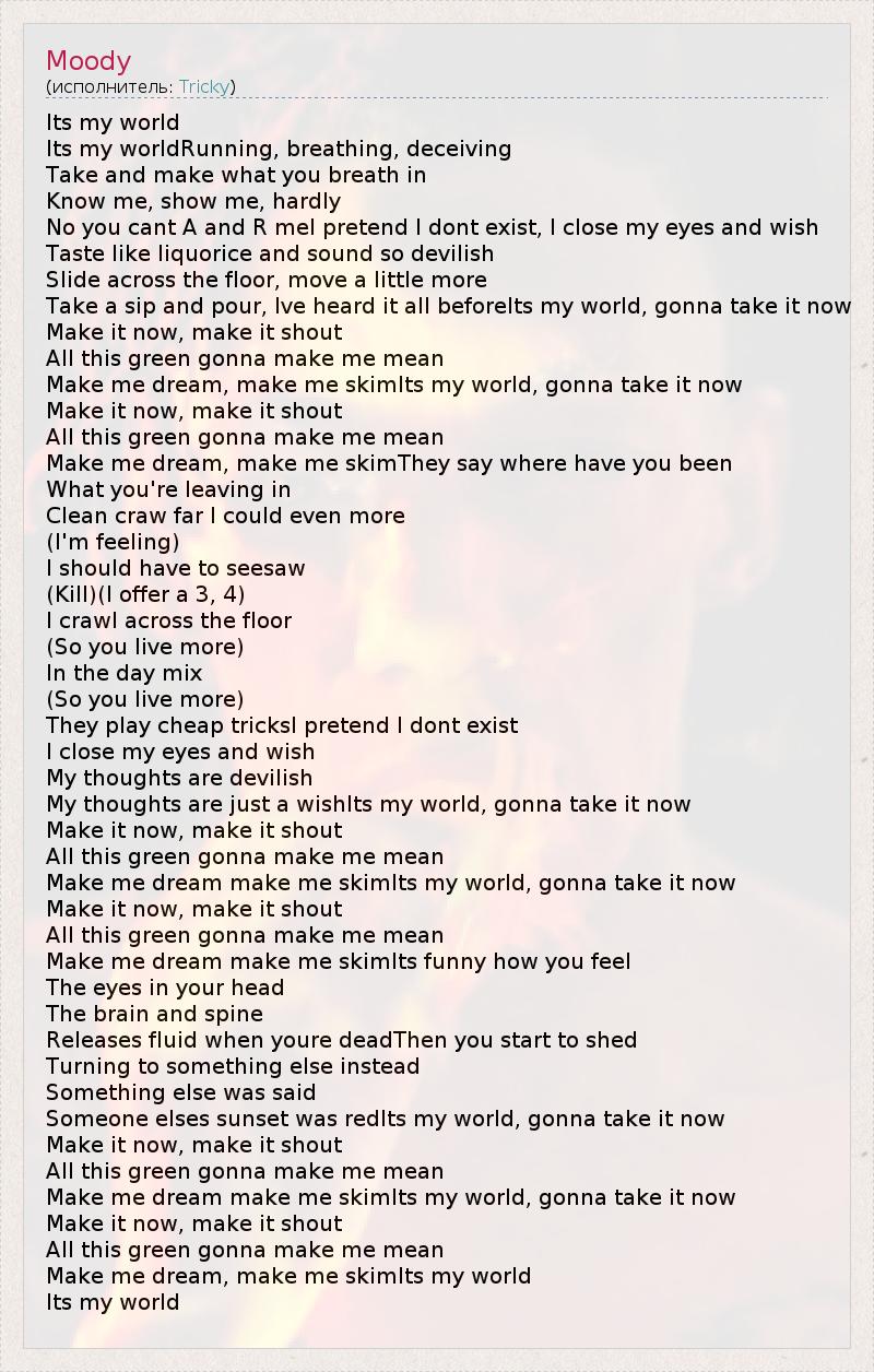Its my world Its my worldRunning, breathing, deceiving Take and make what you breath in Know me, show me, hardly No you cant A and R meI pretend I dont exist, I close my eyes and wish Taste like liquorice and sound so devilish Slide across the floor, move a little more Take a sip and pour, Ive heard it all beforeIts my world, gonna take it now Make it now, make it shout All this green gonna make me mean Make me dream, make me skimIts my world, gonna take it now Make it now, make it shout All this green gonna make me mean Make me dream, make me skimThey say where have you been What you're leaving in Clean craw far I could even more (I'm feeling) I should have to seesaw (Kill)(I offer a 3, 4) I crawl across the floor (So you live more) In the day mix (So you live more) They play cheap tricksI pretend I dont exist I close my eyes and wish My thoughts are devilish My thoughts are just a wishIts my world, gonna take it now Make it now, make it shout All this green gonna make me mean Make me dream make me skimIts my world, gonna take it now Make it now, make it shout All this green gonna make me mean Make me dream make me skimIts funny how you feel The eyes in your head The brain and spine Releases fluid when youre deadThen you start to shed Turning to something else instead Something else was said Someone elses sunset was redIts my world, gonna take it now Make it now, make it shout All this green gonna make me mean Make me dream make me skimIts my world, gonna take it now Make it now, make it shout All this green gonna make me mean Make me dream, make me skimIts my world Its my world