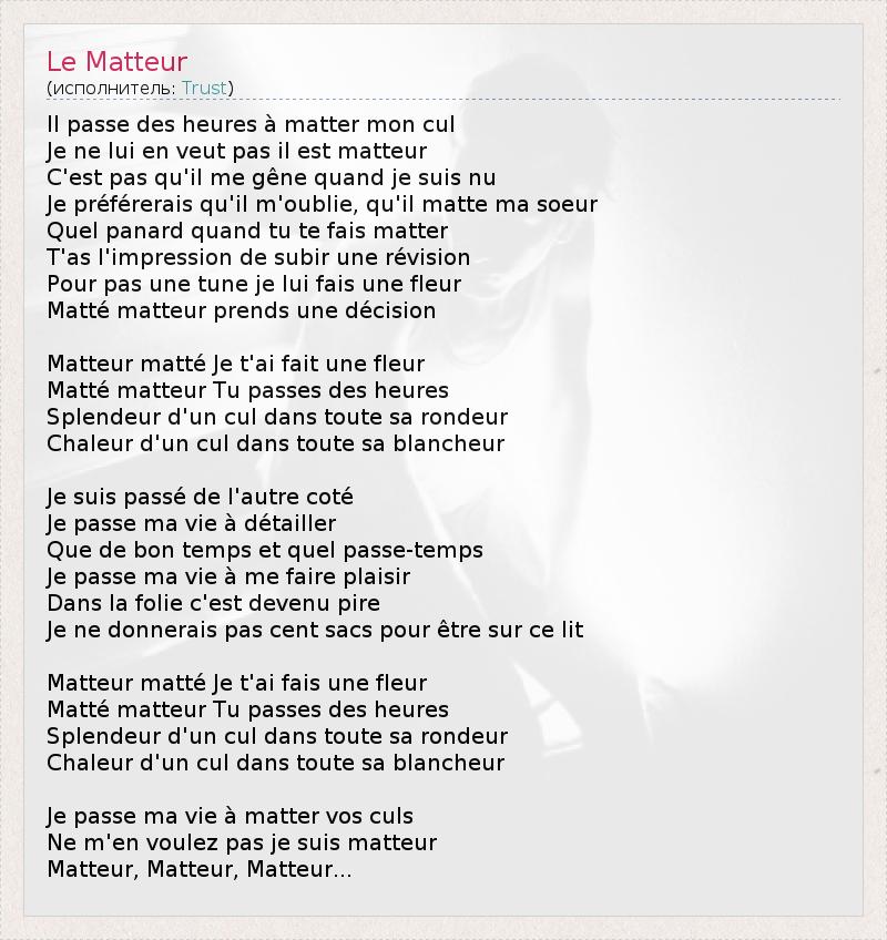 Il passe des heures à matter mon cul Je ne lui en veut pas il est matteur C'est pas qu'il me gêne quand je suis nu Je préférerais qu'il m'oublie, qu'il matte ma soeur Quel panard quand tu te fais matter T'as l'impression de subir une révision Pour pas une tune je lui fais une fleur Matté matteur prends une décision Matteur matté Je t'ai fait une fleur Matté matteur Tu passes des heures Splendeur d'un cul dans toute sa rondeur Chaleur d'un cul dans toute sa blancheur Je suis passé de l'autre coté Je passe ma vie à détailler Que de bon temps et quel passe-temps Je passe ma vie à me faire plaisir Dans la folie c'est devenu pire Je ne donnerais pas cent sacs pour être sur ce lit Matteur matté Je t'ai fais une fleur Matté matteur Tu passes des heures Splendeur d'un cul dans toute sa rondeur Chaleur d'un cul dans toute sa blancheur Je passe ma vie à matter vos culs Ne m'en voulez pas je suis matteur Matteur, Matteur, Matteur...