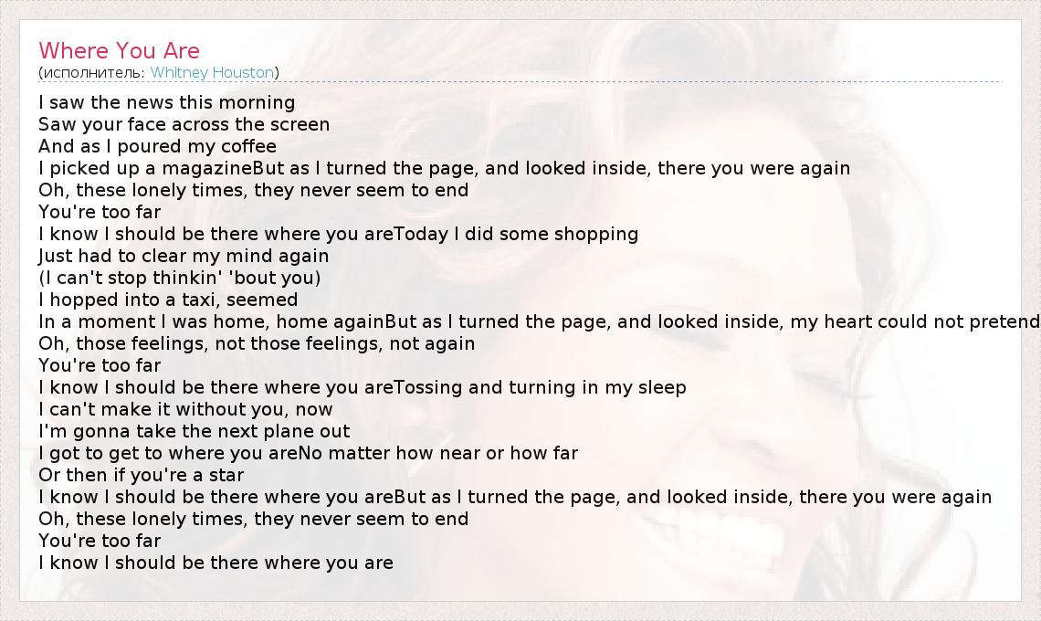 I saw the news this morning Saw your face across the screen And as I poured my coffee I picked up a magazineBut as I turned the page, and looked inside, there you were again Oh, these lonely times, they never seem to end You're too far I know I should be there where you areToday I did some shopping Just had to clear my mind again (I can't stop thinkin' 'bout you) I hopped into a taxi, seemed In a moment I was home, home againBut as I turned the page, and looked inside, my heart could not pretend Oh, those feelings, not those feelings, not again You're too far I know I should be there where you areTossing and turning in my sleep I can't make it without you, now I'm gonna take the next plane out I got to get to where you areNo matter how near or how far Or then if you're a star I know I should be there where you areBut as I turned the page, and looked inside, there you were again Oh, these lonely times, they never seem to end You're too far I know I should be there where you are