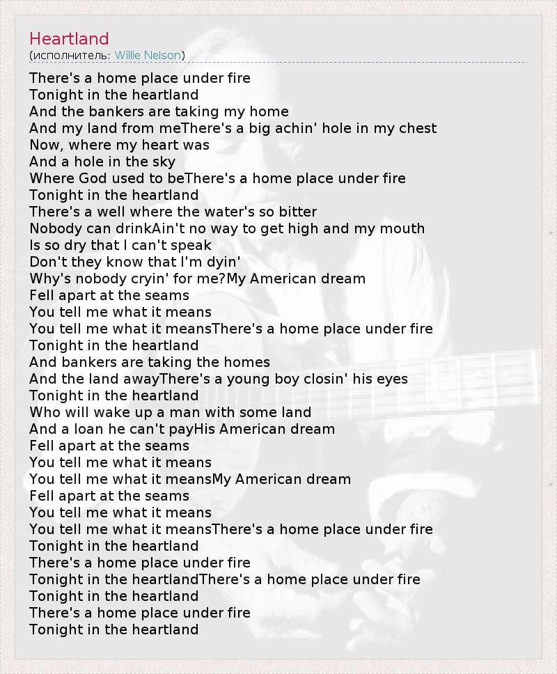 Это интересно:Willie Nelson, полное имя William Hugh Nelson, род. 30 апреля 1933 года) — один из столпов музыки кантри ХХ века, обладатель множества наград, в том числе премий «Грэмми» в категориях «Музыкальная легенда» (1990) и «За жизненные достижения» (1999).Отсчёт музыкальной карьеры Нельсона начинается с 1956 года. На первых порах его собственные записи отвергались боссами звукозаписывающих компаний по причине немодного,... продолжение
