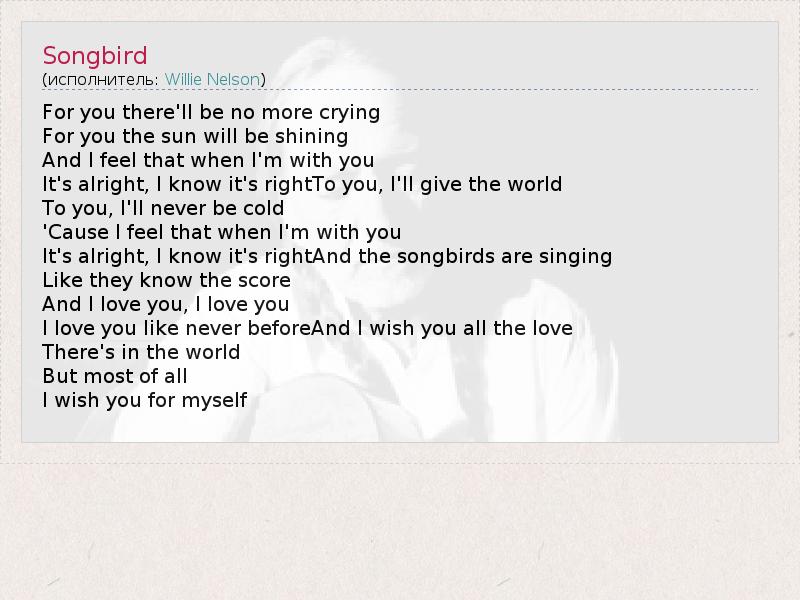 For you there'll be no more crying For you the sun will be shining And I feel that when I'm with you It's alright, I know it's rightTo you, I'll give the world To you, I'll never be cold 'Cause I feel that when I'm with you It's alright, I know it's rightAnd the songbirds are singing Like they know the score And I love you, I love you I love you like never beforeAnd I wish you all the love There's in the world But most of all I wish you for myself