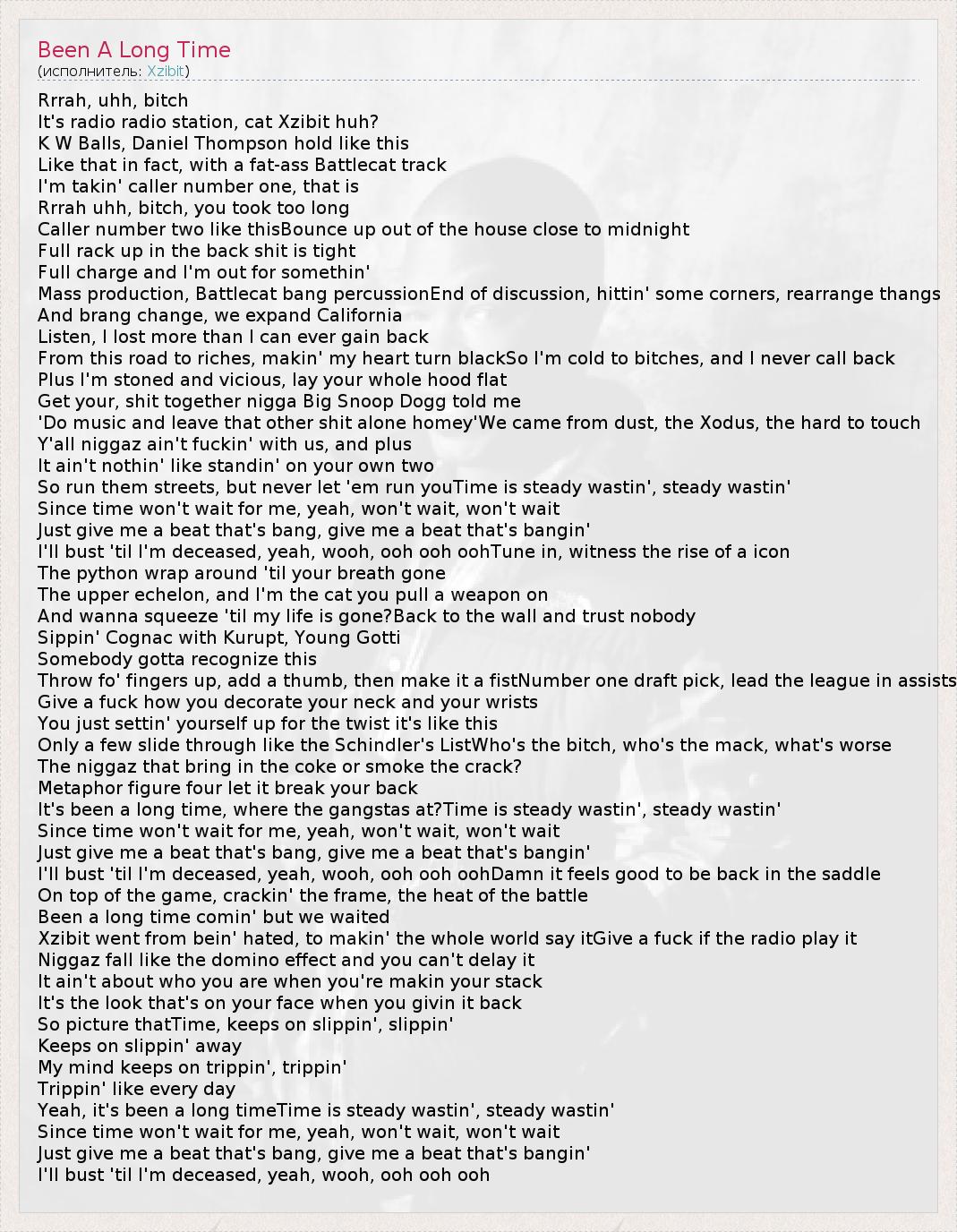 Rrrah, uhh, bitch It's radio radio station, cat Xzibit huh? K W Balls, Daniel Thompson hold like this Like that in fact, with a fat-ass Battlecat track I'm takin' caller number one, that is Rrrah uhh, bitch, you took too long Caller number two like thisBounce up out of the house close to midnight Full rack up in the back shit is tight Full charge and I'm out for somethin' Mass production, Battlecat bang percussionEnd of discussion, hittin' some corners, rearrange thangs And brang change, we expand California Listen, I lost more than I can ever gain back From this road to riches, makin' my heart turn blackSo I'm cold to bitches, and I never call back Plus I'm stoned and vicious, lay your whole hood flat Get your, shit together nigga Big Snoop Dogg told me 'Do music and leave that other shit alone homey'We came from dust, the Xodus, the hard to touch Y'all niggaz ain't fuckin' with us, and plus It ain't nothin' like standin' on your own two So run them streets, but never let 'em run youTime is steady wastin', steady wastin' Since time won't wait for me, yeah, won't wait, won't wait Just give me a beat that's bang, give me a beat that's bangin' I'll bust 'til I'm deceased, yeah, wooh, ooh ooh oohTune in, witness the rise of a icon The python wrap around 'til your breath gone The upper echelon, and I'm the cat you pull a weapon on And wanna squeeze 'til my life is gone?Back to the wall and trust nobody Sippin' Cognac with Kurupt, Young Gotti Somebody gotta recognize this Throw fo' fingers up, add a thumb, then make it a fistNumber one draft pick, lead the league in assists Give a fuck how you decorate your neck and your wrists You just settin' yourself up for the twist it's like this Only a few slide through like the Schindler's ListWho's the bitch, who's the mack, what's worse The niggaz that bring in the coke or smoke the crack? Metaphor figure four let it break your back It's been a long time, where the gangstas at?Time is steady wastin', steady wastin' Since time won't wait for me, yeah, won't wait, won't wait Just give me a beat that's bang, give me a beat that's bangin' I'll bust 'til I'm deceased, yeah, wooh, ooh ooh oohDamn it feels good to be back in the saddle On top of the game, crackin' the frame, the heat of the battle Been a long time comin' but we waited Xzibit went from bein' hated, to makin' the whole world say itGive a fuck if the radio play it Niggaz fall like the domino effect and you can't delay it It ain't about who you are when you're makin your stack It's the look that's on your face when you givin it back So picture thatTime, keeps on slippin', slippin' Keeps on slippin' away My mind keeps on trippin', trippin' Trippin' like every day Yeah, it's been a long timeTime is steady wastin', steady wastin' Since time won't wait for me, yeah, won't wait, won't wait Just give me a beat that's bang, give me a beat that's bangin' I'll bust 'til I'm deceased, yeah, wooh, ooh ooh ooh