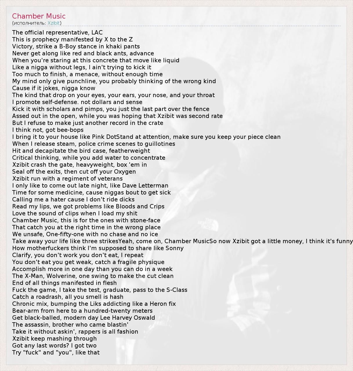 The official representative, LAC This is prophecy manifested by X to the Z Victory, strike a B-Boy stance in khaki pants Never get along like red and black ants, advance When you're staring at this concrete that move like liquid Like a nigga without legs, I ain't trying to kick it Too much to finish, a menace, without enough time My mind only give punchline, you probably thinking of the wrong kind Cause if it jokes, nigga know The kind that drop on your eyes, your ears, your nose, and your throat I promote self-defense. not dollars and sense Kick it with scholars and pimps, you just the last part over the fence Assed out in the open, while you was hoping that Xzibit was second rate But I refuse to make just another record in the crate I think not, got bee-bops I bring it to your house like Pink DotStand at attention, make sure you keep your piece clean When I release steam, police crime scenes to guillotines Hit and decapitate the bird case, featherweight Critical thinking, while you add water to concentrate Xzibit crash the gate, heavyweight, box 'em in Seal off the exits, then cut off your Oxygen Xzibit run with a regiment of veterans I only like to come out late night, like Dave Letterman Time for some medicine, cause niggas bout to get sick Calling me a hater cause I don't ride dicks Read my lips, we got problems like Bloods and Crips Love the sound of clips when I load my shit Chamber Music, this is for the ones with stone-face That catch you at the right time in the wrong place We unsafe, One-fifty-one with no chase and no ice Take away your life like three strikesYeah, come on, Chamber MusicSo now Xzibit got a little money, I think it's funny How motherfuckers think I'm supposed to share like Sonny Clarify, you don't work you don't eat, I repeat You don't eat you get weak, catch a fragile physique Accomplish more in one day than you can do in a week The X-Man, Wolverine, one swing to make the cut clean End of all things manifested in flesh Fuck the game, I take the test, graduate, pass to the S-Class Catch a roadrash, all you smell is hash Chronic mix, bumping the Liks addicting like a Heron fix Bear-arm from here to a hundred-twenty meters Get black-balled, modern day Lee Harvey Oswald The assassin, brother who came blastin' Take it without askin', rappers is all fashion Xzibit keep mashing through Got any last words? I got two Try "fuck" and "you", like that