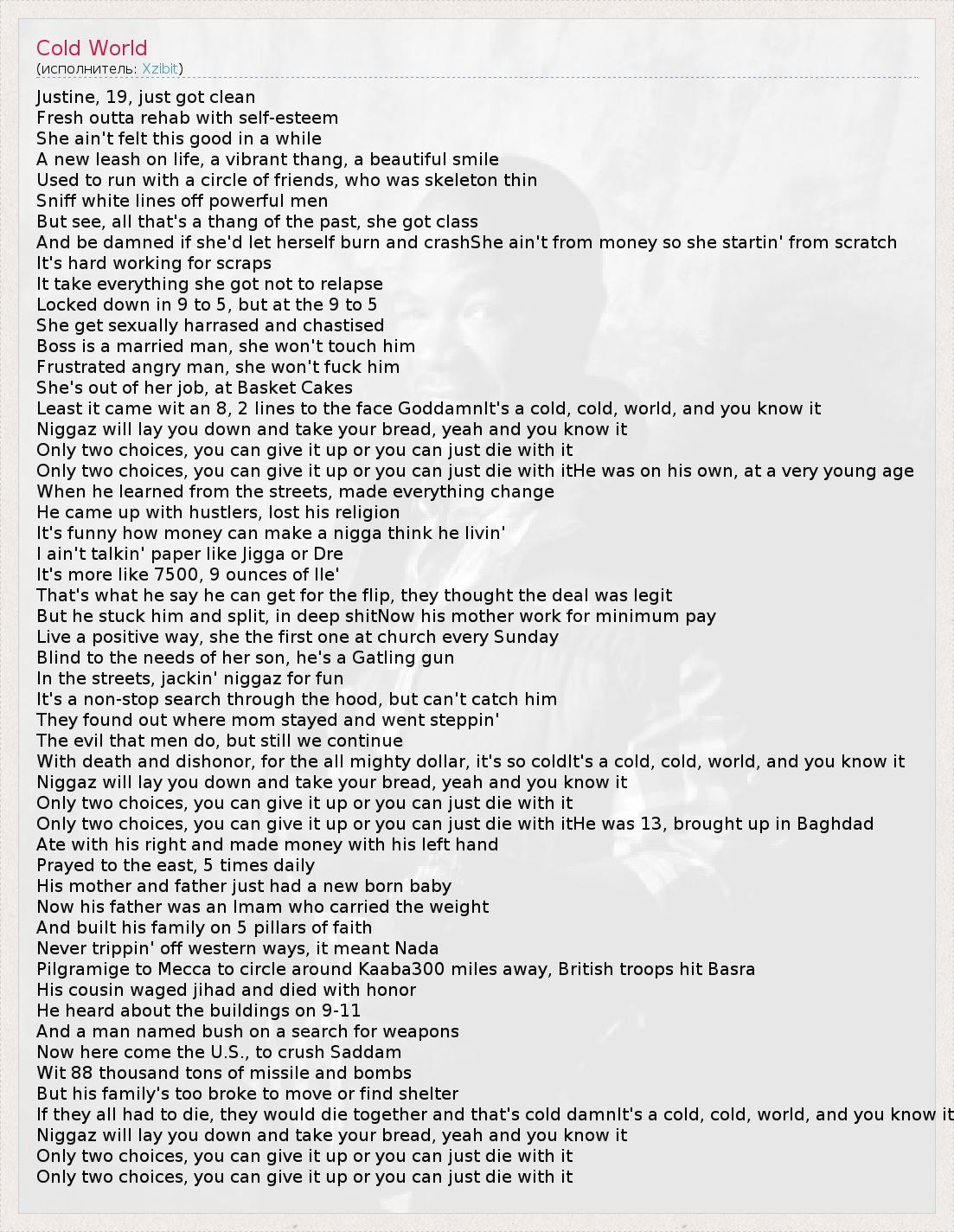 Justine, 19, just got clean Fresh outta rehab with self-esteem She ain't felt this good in a while A new leash on life, a vibrant thang, a beautiful smile Used to run with a circle of friends, who was skeleton thin Sniff white lines off powerful men But see, all that's a thang of the past, she got class And be damned if she'd let herself burn and crashShe ain't from money so she startin' from scratch It's hard working for scraps It take everything she got not to relapse Locked down in 9 to 5, but at the 9 to 5 She get sexually harrased and chastised Boss is a married man, she won't touch him Frustrated angry man, she won't fuck him She's out of her job, at Basket Cakes Least it came wit an 8, 2 lines to the face GoddamnIt's a cold, cold, world, and you know it Niggaz will lay you down and take your bread, yeah and you know it Only two choices, you can give it up or you can just die with it Only two choices, you can give it up or you can just die with itHe was on his own, at a very young age When he learned from the streets, made everything change He came up with hustlers, lost his religion It's funny how money can make a nigga think he livin' I ain't talkin' paper like Jigga or Dre It's more like 7500, 9 ounces of lle' That's what he say he can get for the flip, they thought the deal was legit But he stuck him and split, in deep shitNow his mother work for minimum pay Live a positive way, she the first one at church every Sunday Blind to the needs of her son, he's a Gatling gun In the streets, jackin' niggaz for fun It's a non-stop search through the hood, but can't catch him They found out where mom stayed and went steppin' The evil that men do, but still we continue With death and dishonor, for the all mighty dollar, it's so coldIt's a cold, cold, world, and you know it Niggaz will lay you down and take your bread, yeah and you know it Only two choices, you can give it up or you can just die with it Only two choices, you can give it up or you can just die with itHe was 13, brought up in Baghdad Ate with his right and made money with his left hand Prayed to the east, 5 times daily His mother and father just had a new born baby Now his father was an Imam who carried the weight And built his family on 5 pillars of faith Never trippin' off western ways, it meant Nada Pilgramige to Mecca to circle around Kaaba300 miles away, British troops hit Basra His cousin waged jihad and died with honor He heard about the buildings on 9-11 And a man named bush on a search for weapons Now here come the U.S., to crush Saddam Wit 88 thousand tons of missile and bombs But his family's too broke to move or find shelter If they all had to die, they would die together and that's cold damnIt's a cold, cold, world, and you know it Niggaz will lay you down and take your bread, yeah and you know it Only two choices, you can give it up or you can just die with it Only two choices, you can give it up or you can just die with it