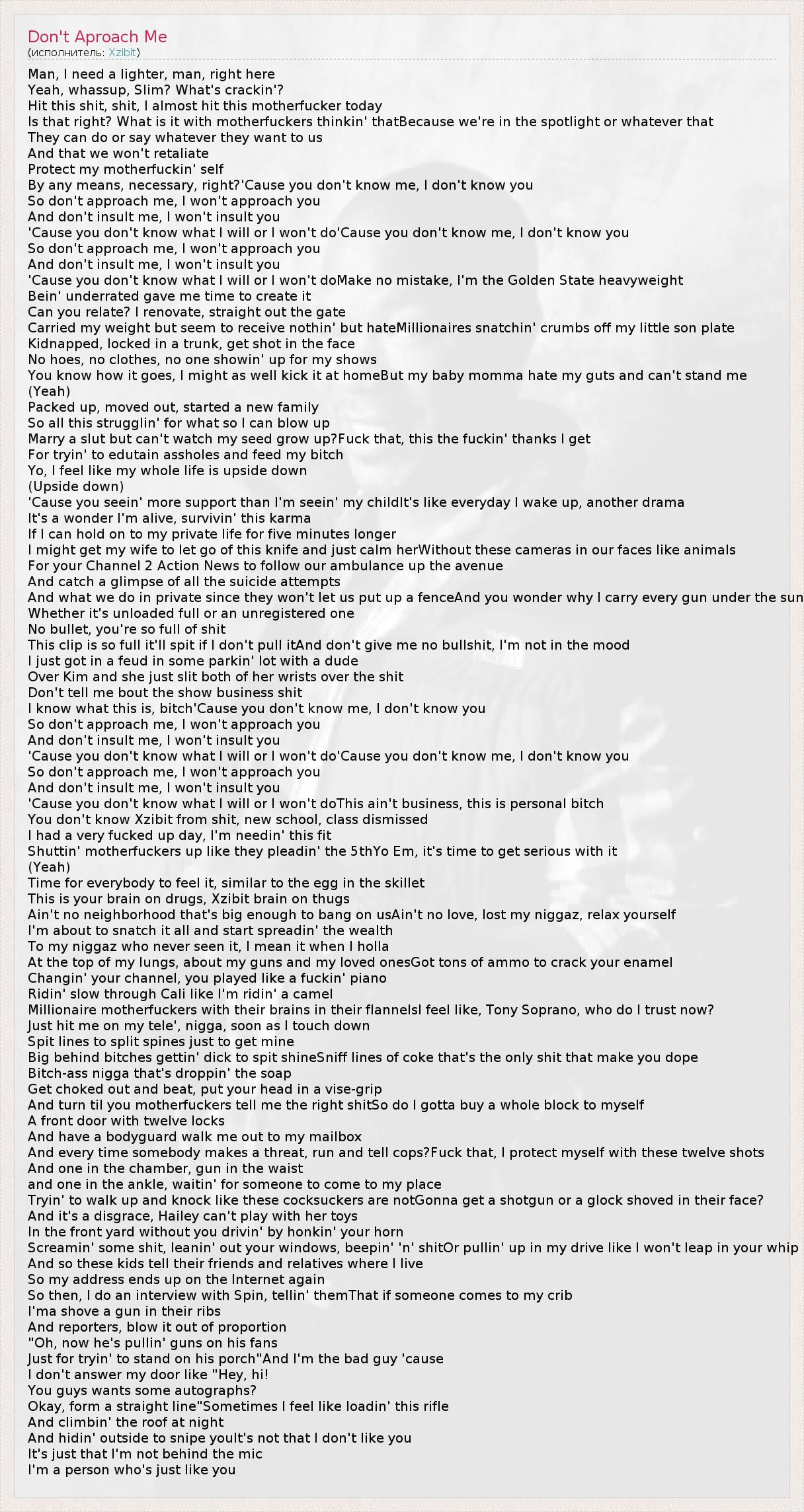 Man, I need a lighter, man, right here Yeah, whassup, Slim? What's crackin'? Hit this shit, shit, I almost hit this motherfucker today Is that right? What is it with motherfuckers thinkin' thatBecause we're in the spotlight or whatever that They can do or say whatever they want to us And that we won't retaliate Protect my motherfuckin' self By any means, necessary, right?'Cause you don't know me, I don't know you So don't approach me, I won't approach you And don't insult me, I won't insult you 'Cause you don't know what I will or I won't do'Cause you don't know me, I don't know you So don't approach me, I won't approach you And don't insult me, I won't insult you 'Cause you don't know what I will or I won't doMake no mistake, I'm the Golden State heavyweight Bein' underrated gave me time to create it Can you relate? I renovate, straight out the gate Carried my weight but seem to receive nothin' but hateMillionaires snatchin' crumbs off my little son plate Kidnapped, locked in a trunk, get shot in the face No hoes, no clothes, no one showin' up for my shows You know how it goes, I might as well kick it at homeBut my baby momma hate my guts and can't stand me (Yeah) Packed up, moved out, started a new family So all this strugglin' for what so I can blow up Marry a slut but can't watch my seed grow up?Fuck that, this the fuckin' thanks I get For tryin' to edutain assholes and feed my bitch Yo, I feel like my whole life is upside down (Upside down) 'Cause you seein' more support than I'm seein' my childIt's like everyday I wake up, another drama It's a wonder I'm alive, survivin' this karma If I can hold on to my private life for five minutes longer I might get my wife to let go of this knife and just calm herWithout these cameras in our faces like animals For your Channel 2 Action News to follow our ambulance up the avenue And catch a glimpse of all the suicide attempts And what we do in private since they won't let us put up a fenceAnd you wonder why I carry every gun under the sun Whether it's unloaded full or an unregistered one No bullet, you're so full of shit This clip is so full it'll spit if I don't pull itAnd don't give me no bullshit, I'm not in the mood I just got in a feud in some parkin' lot with a dude Over Kim and she just slit both of her wrists over the shit Don't tell me bout the show business shit I know what this is, bitch'Cause you don't know me, I don't know you So don't approach me, I won't approach you And don't insult me, I won't insult you 'Cause you don't know what I will or I won't do'Cause you don't know me, I don't know you So don't approach me, I won't approach you And don't insult me, I won't insult you 'Cause you don't know what I will or I won't doThis ain't business, this is personal bitch You don't know Xzibit from shit, new school, class dismissed I had a very fucked up day, I'm needin' this fit Shuttin' motherfuckers up like they pleadin' the 5thYo Em, it's time to get serious with it (Yeah) Time for everybody to feel it, similar to the egg in the skillet This is your brain on drugs, Xzibit brain on thugs Ain't no neighborhood that's big enough to bang on usAin't no love, lost my niggaz, relax yourself I'm about to snatch it all and start spreadin' the wealth To my niggaz who never seen it, I mean it when I holla At the top of my lungs, about my guns and my loved onesGot tons of ammo to crack your enamel Changin' your channel, you played like a fuckin' piano Ridin' slow through Cali like I'm ridin' a camel Millionaire motherfuckers with their brains in their flannelsI feel like, Tony Soprano, who do I trust now? Just hit me on my tele', nigga, soon as I touch down Spit lines to split spines just to get mine Big behind bitches gettin' dick to spit shineSniff lines of coke that's the only shit that make you dope Bitch-ass nigga that's droppin' the soap Get choked out and beat, put your head in a vise-grip And turn til you motherfuckers tell me the right shitSo do I gotta buy a whole block to myself A front door with twelve locks And have a bodyguard walk me out to my mailbox And every time somebody makes a threat, run and tell cops?Fuck that, I protect myself with these twelve shots And one in the chamber, gun in the waist and one in the ankle, waitin' for someone to come to my place Tryin' to walk up and knock like these cocksuckers are notGonna get a shotgun or a glock shoved in their face? And it's a disgrace, Hailey can't play with her toys In the front yard without you drivin' by honkin' your horn Screamin' some shit, leanin' out your windows, beepin' 'n' shitOr pullin' up in my drive like I won't leap in your whip And so these kids tell their friends and relatives where I live So my address ends up on the Internet again So then, I do an interview with Spin, tellin' themThat if someone comes to my crib I'ma shove a gun in their ribs And reporters, blow it out of proportion "Oh, now he's pullin' guns on his fans Just for tryin' to stand on his porch"And I'm the bad guy 'cause I don't answer my door like "Hey, hi! You guys wants some autographs? Okay, form a straight line"Sometimes I feel like loadin' this rifle And climbin' the roof at night And hidin' outside to snipe youIt's not that I don't like you It's just that I'm not behind the mic I'm a person who's just like you