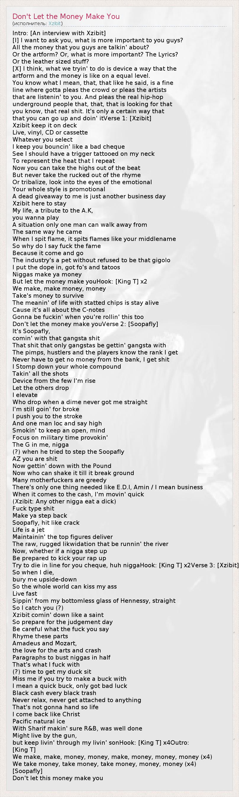 Intro: [An interview with Xzibit] [I] I want to ask you, what is more important to you guys? All the money that you guys are talkin' about? Or the artform? Or, what is more important? The Lyrics? Or the leather sized stuff? [X] I think, what we tryin' to do is device a way that the artform and the money is like on a equal level. You know what I mean, that, that like he said, is a fine line where gotta pleas the crowd or pleas the artists that are listenin' to you. And pleas the real hip-hop underground people that, that, that is looking for that you know, that real shit. It's only a certain way that that you can go up and doin' itVerse 1: [Xzibit] Xzibit keep it on deck Live, vinyl, CD or cassette Whatever you select I keep you bouncin' like a bad cheque See I should have a trigger tattooed on my neck To represent the heat that I repeat Now you can take the highs out of the beat But never take the rucked out of the rhyme Or tribalize, look into the eyes of the emotional Your whole style is promotional A dead giveaway to me is just another business day Xzibit here to stay My life, a tribute to the A.K, you wanna play A situation only one man can walk away from The same way he came When I spit flame, it spits flames like your middlename So why do I say fuck the fame Because it come and go The industry's a pet without refused to be that gigolo I put the dope in, got fo's and tatoos Niggas make ya money But let the money make youHook: [King T] x2 We make, make money, money Take's money to survive The meanin' of life with statted chips is stay alive Cause it's all about the C-notes Gonna be fuckin' when you're rollin' this too Don't let the money make youVerse 2: [Soopafly] It's Soopafly, comin' with that gangsta shit That shit that only gangstas be gettin' gangsta with The pimps, hustlers and the players know the rank I get Never have to get no money from the bank, I get shit I Stomp down your whole compound Takin' all the shots Device from the few I'm rise Let the others drop I elevate Who drop when a dime never got me straight I'm still goin' for broke I push you to the stroke And one man loc and say high Smokin' to keep an open, mind Focus on military time provokin' The G in me, nigga (?) when he tried to step the Soopafly AZ you are shit Now gettin' down with the Pound Now who can shake it till it break ground Many motherfuckers are greedy There's only one thing needed like E.D.I, Amin / I mean business When it comes to the cash, I'm movin' quick (Xzibit: Any other nigga eat a dick) Fuck type shit Make ya step back Soopafly, hit like crack Life is a jet Maintainin' the top figures deliver The raw, rugged likwidation that be runnin' the river Now, whether if a nigga step up Be prepared to kick your rap up Try to die in line for you cheque, huh niggaHook: [King T] x2Verse 3: [Xzibit] So when I die, bury me upside-down So the whole world can kiss my ass Live fast Sippin' from my bottomless glass of Hennessy, straight So I catch you (?) Xzibit comin' down like a saint So prepare for the judgement day Be careful what the fuck you say Rhyme these parts Amadeus and Mozart, the love for the arts and crash Paragraphs to bust niggas in half That's what I fuck with (?) time to get my duck sit Miss me if you try to make a buck with I mean a quick buck, only got bad luck Black cash every black trash Never relax, never get attached to anything That's not gonna hand so life I come back like Christ Pacific natural ice With Sharif makin' sure R&B, was well done Might live by the gun, but keep livin' through my livin' sonHook: [King T] x4Outro: [King T] We make, make, money, money, make, money, money, money (x4) We take money, take money, take money, money, money (x4) [Soopafly] Don't let this money make you