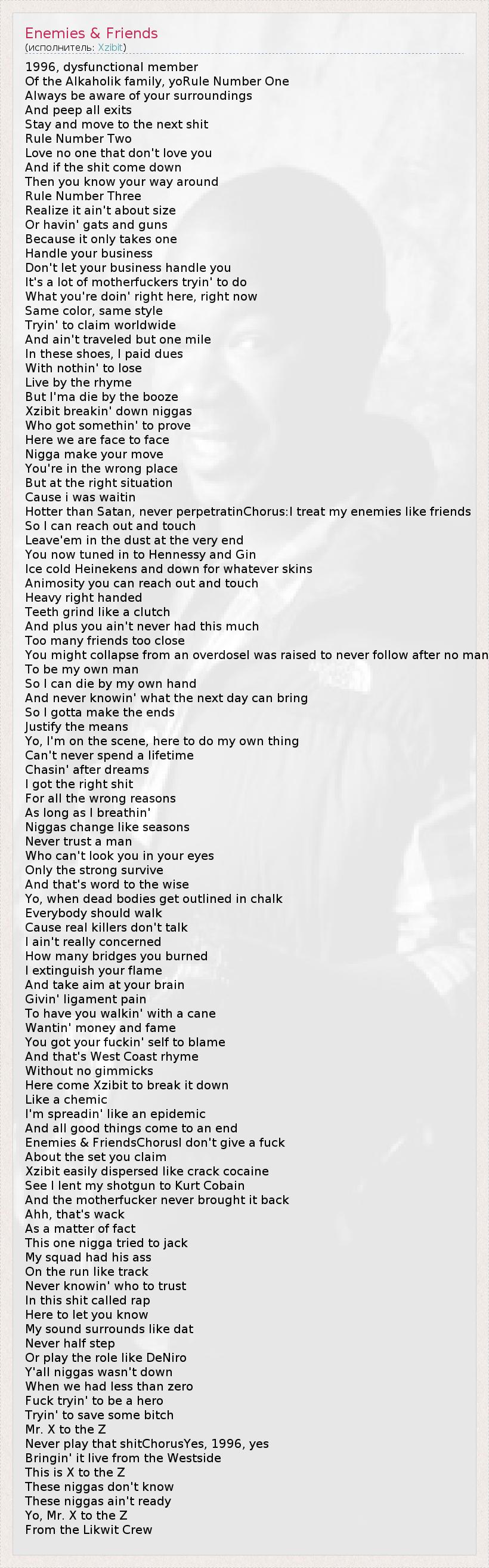 1996, dysfunctional member Of the Alkaholik family, yoRule Number One Always be aware of your surroundings And peep all exits Stay and move to the next shit Rule Number Two Love no one that don't love you And if the shit come down Then you know your way around Rule Number Three Realize it ain't about size Or havin' gats and guns Because it only takes one Handle your business Don't let your business handle you It's a lot of motherfuckers tryin' to do What you're doin' right here, right now Same color, same style Tryin' to claim worldwide And ain't traveled but one mile In these shoes, I paid dues With nothin' to lose Live by the rhyme But I'ma die by the booze Xzibit breakin' down niggas Who got somethin' to prove Here we are face to face Nigga make your move You're in the wrong place But at the right situation Cause i was waitin Hotter than Satan, never perpetratinChorus:I treat my enemies like friends So I can reach out and touch Leave'em in the dust at the very end You now tuned in to Hennessy and Gin Ice cold Heinekens and down for whatever skins Animosity you can reach out and touch Heavy right handed Teeth grind like a clutch And plus you ain't never had this much Too many friends too close You might collapse from an overdoseI was raised to never follow after no man To be my own man So I can die by my own hand And never knowin' what the next day can bring So I gotta make the ends Justify the means Yo, I'm on the scene, here to do my own thing Can't never spend a lifetime Chasin' after dreams I got the right shit For all the wrong reasons As long as I breathin' Niggas change like seasons Never trust a man Who can't look you in your eyes Only the strong survive And that's word to the wise Yo, when dead bodies get outlined in chalk Everybody should walk Cause real killers don't talk I ain't really concerned How many bridges you burned I extinguish your flame And take aim at your brain Givin' ligament pain To have you walkin' with a cane Wantin' money and fame You got your fuckin' self to blame And that's West Coast rhyme Without no gimmicks Here come Xzibit to break it down Like a chemic I'm spreadin' like an epidemic And all good things come to an end Enemies & FriendsChorusI don't give a fuck About the set you claim Xzibit easily dispersed like crack cocaine See I lent my shotgun to Kurt Cobain And the motherfucker never brought it back Ahh, that's wack As a matter of fact This one nigga tried to jack My squad had his ass On the run like track Never knowin' who to trust In this shit called rap Here to let you know My sound surrounds like dat Never half step Or play the role like DeNiro Y'all niggas wasn't down When we had less than zero Fuck tryin' to be a hero Tryin' to save some bitch Mr. X to the Z Never play that shitChorusYes, 1996, yes Bringin' it live from the Westside This is X to the Z These niggas don't know These niggas ain't ready Yo, Mr. X to the Z From the Likwit Crew